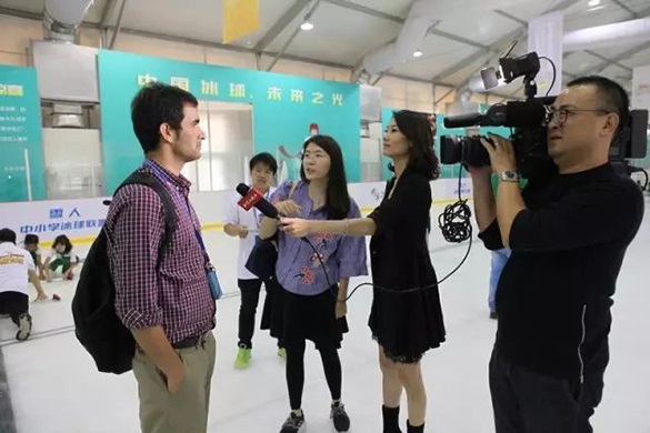 中华世纪坛冰场的冰面上,海淀区翠微小学的学生们在专业教练的指导下正在开展滑冰、冰壶和冰球等体育课。来自巴西、阿根廷、菲律宾、泰国等21个一带一路沿线国家的近30位媒体记者纷纷举起采访机和照相机,记录着眼前火热而又欢快的运动场景。他们当中大多数人是第一次接触到冰雪运动。