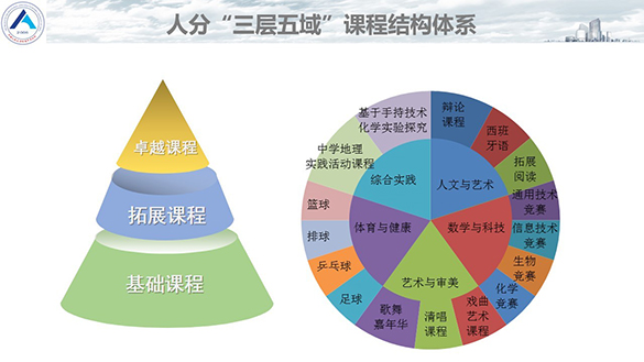 为切实贯彻党的教育方针,落实立德树人根本任务,在三年的新品牌建设中,面对已有的课程资源和成果,人分没有简单做“加法”,而是先严谨界定“品牌”内涵,明晰了人分要创建海淀区优质中学品牌、教育资源优质均衡发展品牌、非营利优质民办校品牌的建设目标。学校结合中国学生核心素养及高中新课程改革思路,将学校办学目标和育人目标进行对标性思考,确立了人分课程建设“三度”理念——精度、深度、温度。并在此基础上,通过对课程进行整合优化,构建了“三层五域”课程体系。