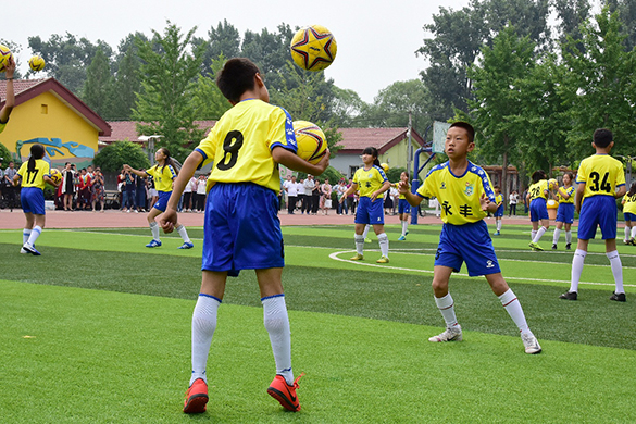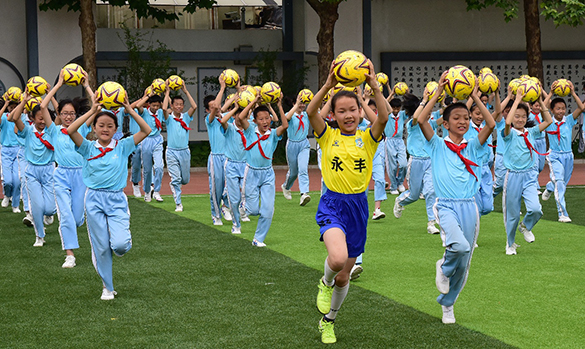 十年前,永丰中心小学足球队还只是一个兴趣小组,如今,足球在永丰小学已经做到了全校普及,足球梯队已经形成,并且各级比赛中都取得了不俗的成绩。作为全国足球特色学校,学校开设了《足球》校本课程,面向全体学生,坚持做到“五个一”,即“每人一球,每天一训,每周一课,每周一操,每学期一赛”,以赛促发展、以赛促成长,使所有的学生不断增强体质掌握足球技能,感受足球魅力,体格健魄、充满自信。