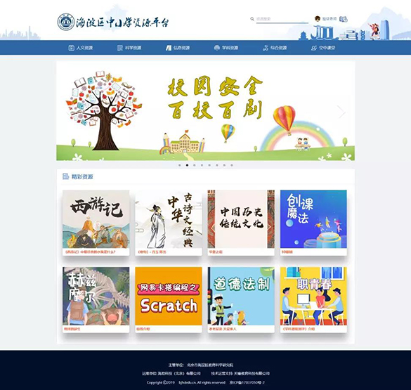 海淀区中小学资源平台内设人文、科学、信息、学科、综合五大资源库。