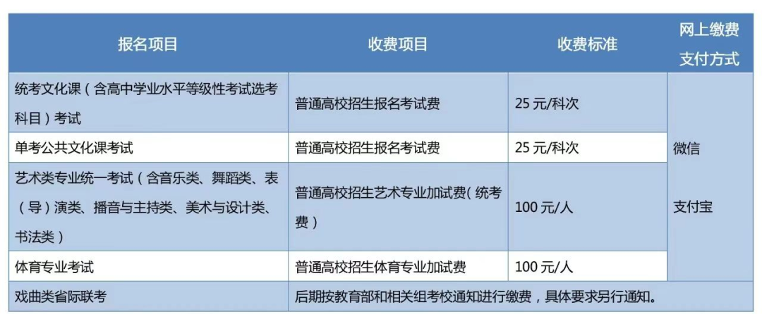 答:考生在高考报名第二阶段(网上填报个人信息并缴费)同时缴纳高考文化课和艺术类专业统考的报名考试费。音乐类、舞蹈类、表(导)演类、播音与主持类、美术与设计类、书法类6类艺术类统考收费标准为每人100元,兼报多个科类及方向的需分别缴费。