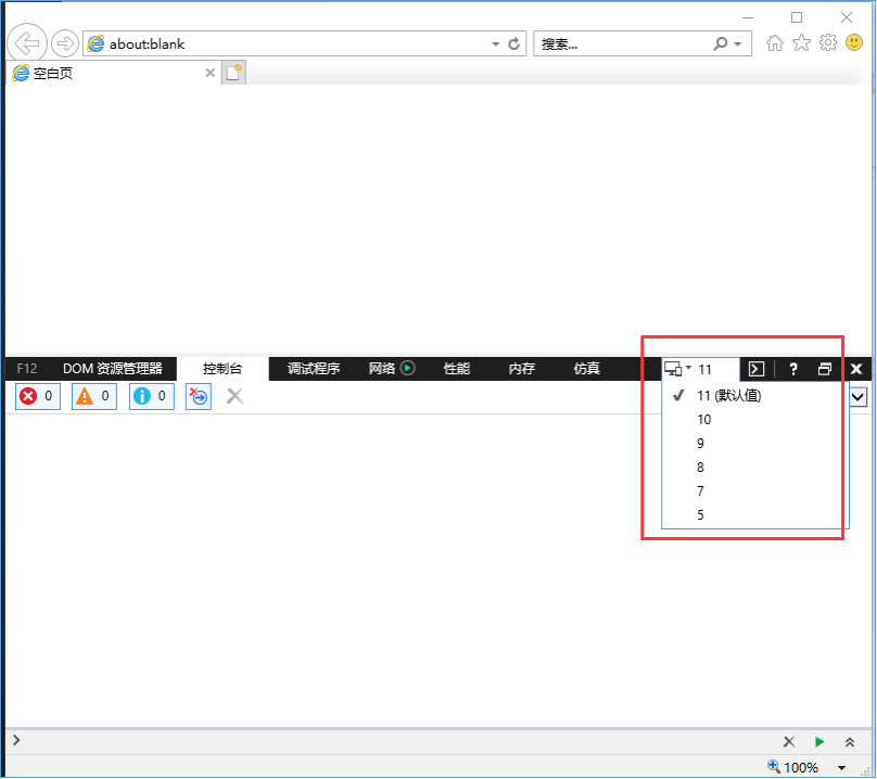 打开IE浏览器,点击“F12”键,会出现浏览器模式设置,要求此处设置的版本必须与浏览器实际版本一致。