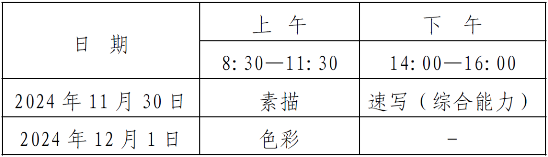 1. 考试时间:2024年11月30日-12月1日,具体考试场次及时间以准考证为准;考试时须携带考生本人有效身份证件和准考证入场。11月30日为形体测量环节,上午男生,下午女生。12月1日为考试环节,上午男生,下午女生。