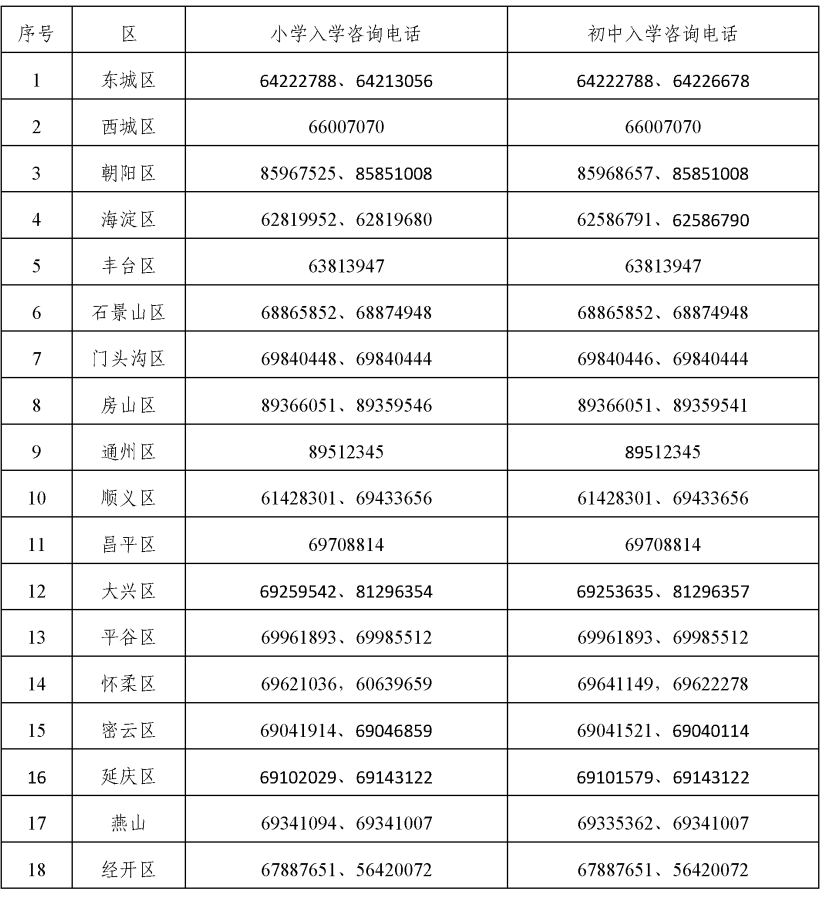 各区义务教育阶段入学工作咨询电话