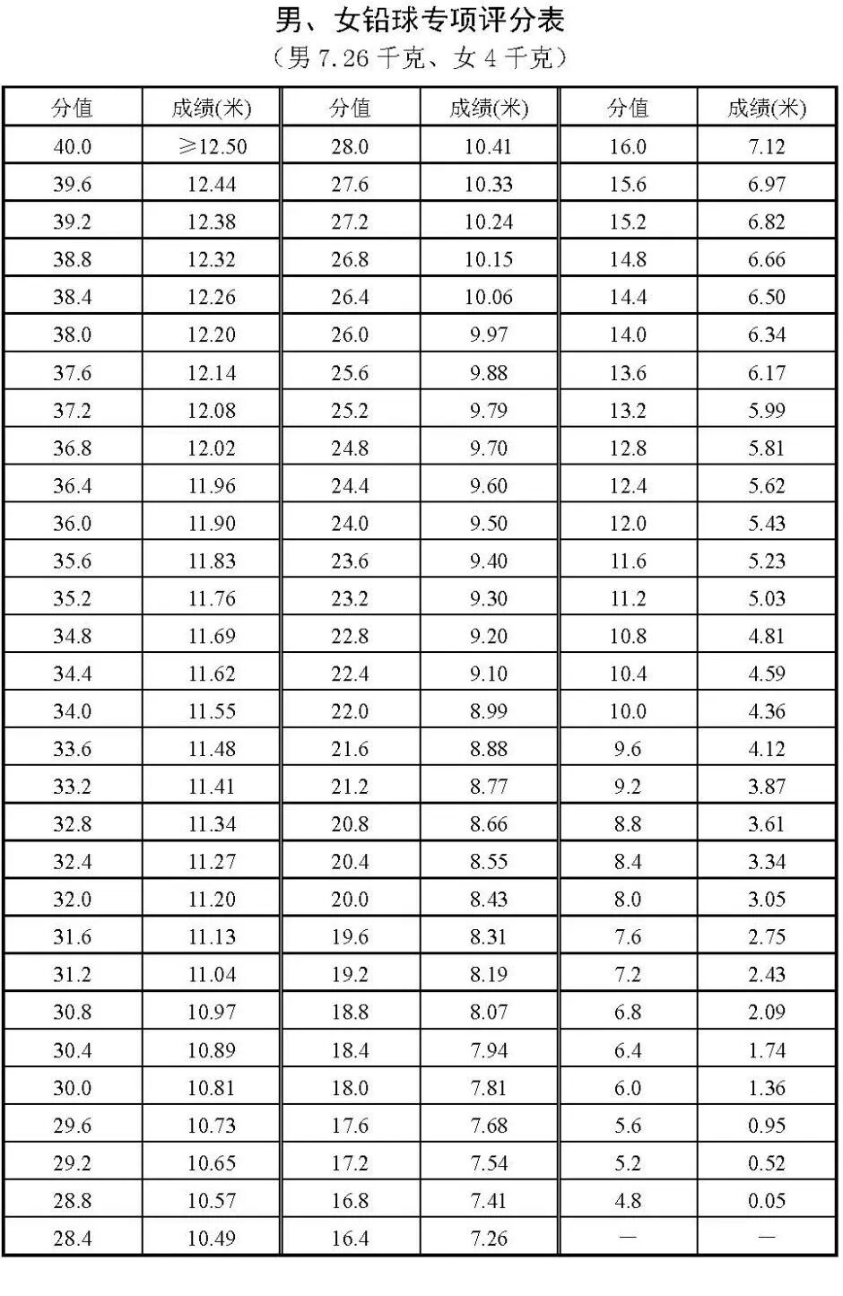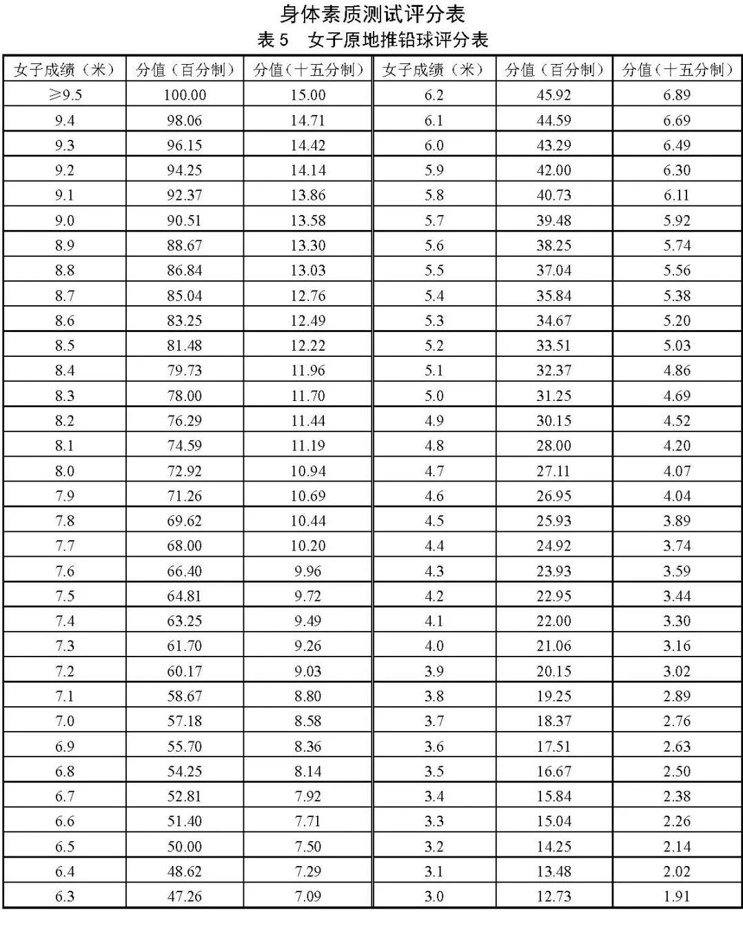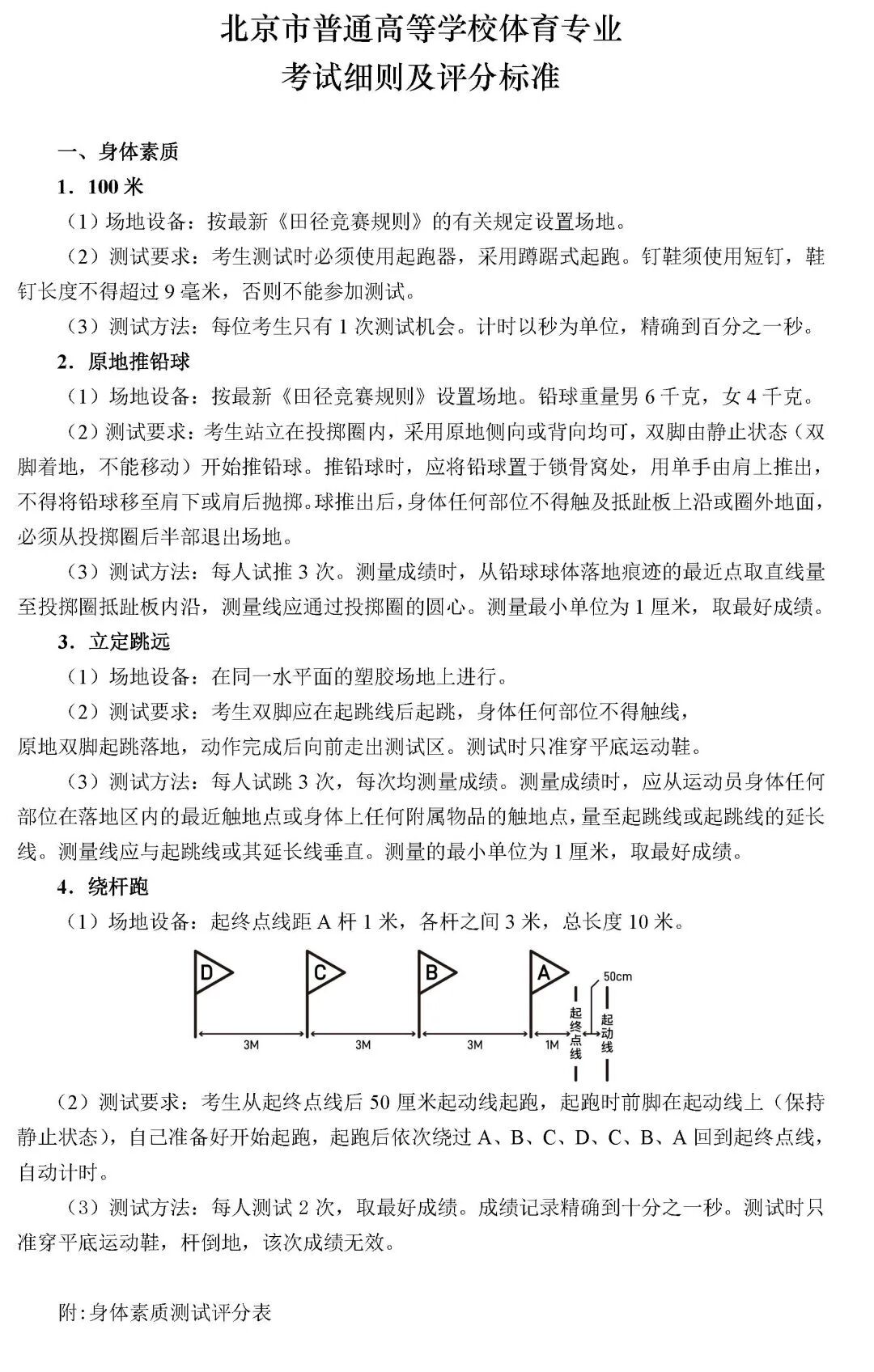 身体素质考试项目包括4项:100米跑、绕杆跑、立定跳远和原地推铅球(男6kg,女4kg )。