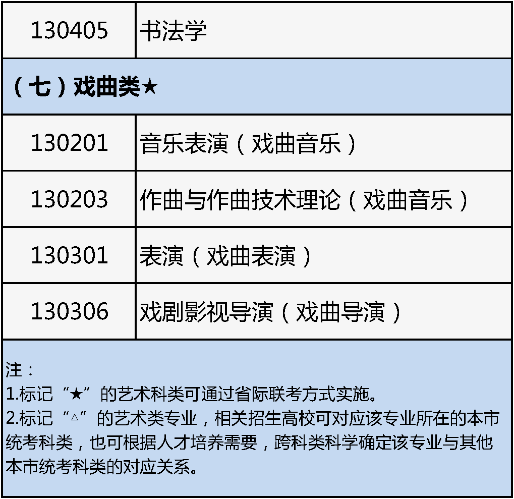 2.7个艺术类考试科类下设的艺术类专业招生实行“文化素质+专业能力”的考试评价方式。招生高校可根据自身办学定位和人才培养实际,对考生专业能力提出艺术科类相对应的专业要求,并使用我市统考成绩、省际联考成绩或高校校考成绩作为专业成绩进行录取。专业目录中标记“★”的科类为戏曲类,可通过省际联考方式实施,标记“△”的艺术类专业,相关招生高校可对应该专业所在的本市统考科类,也可根据人才培养需要,跨科类科学确定该专业与本市统考科类的对应关系。