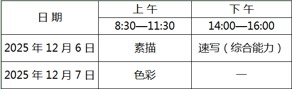 考试包括素描、速写(综合能力)、色彩三个科目,各科目满分100分。