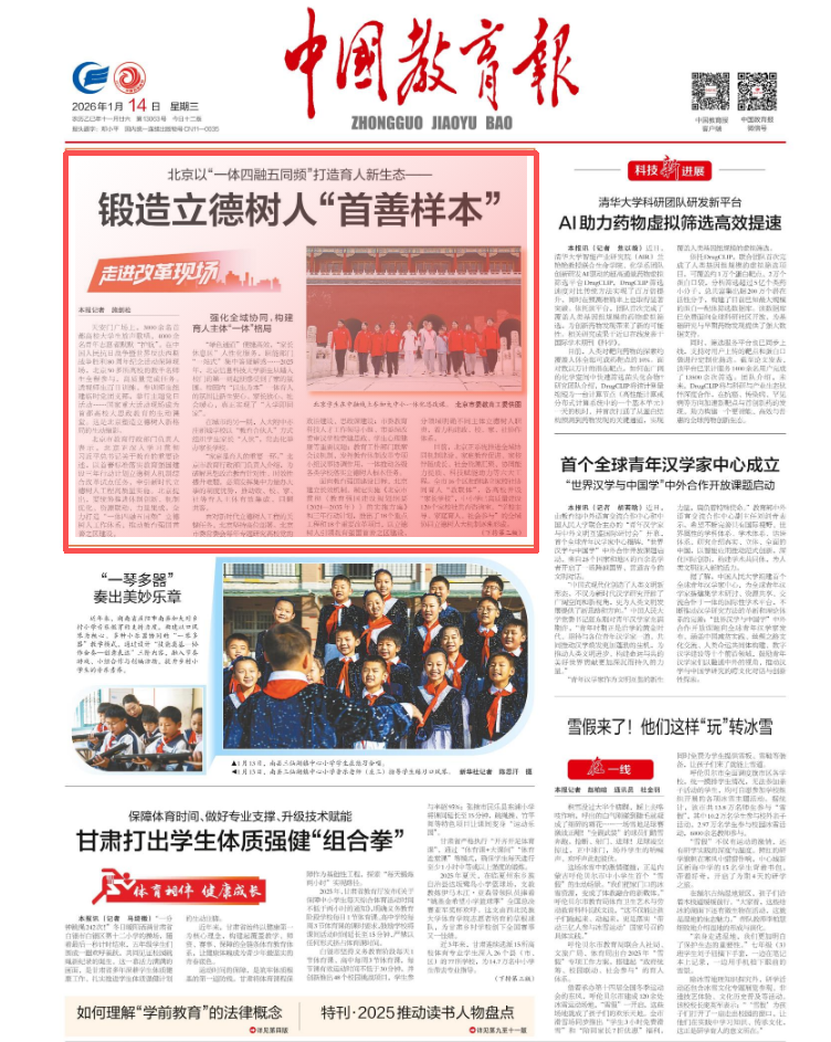 今天,《中国教育报》头版刊登了《北京以“一体四融五同频”打造育人新生态——锻造立德树人“首善样本”》。全文如下: