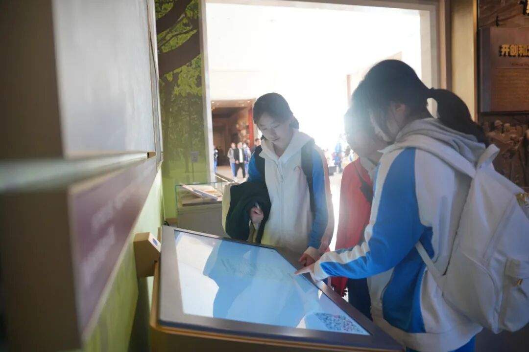 党史展览馆的外观高大宏伟且庄严肃穆,中国共产党党旗在大楼前的阶梯之上面对着灿烂的阳光坚定地飘扬。步入展厅,时光的隧道轰然开启,2600余幅图片、3500多件文物配以逼真的复原景观和历史记录片让党的历史在我们面前立体地呈现。同学们身临其境,穿行于百年峥嵘岁月中。