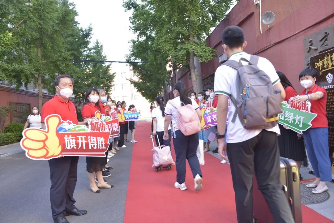 △ 海淀实验中学校长林伟明和老师们举起“加油板”,夹道为同学们送上了祝福,让同学们提前感受到高考“仪式感”~