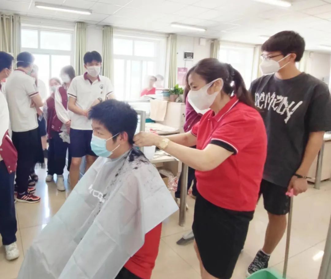 △ 海淀实验中学高三老师沈幼凤在考前帮同学们修剪头发,让大家神清气爽、自信满满地走进考场。同学们慕名而来,有序排起了队,还主动承担了洒扫的工作。
