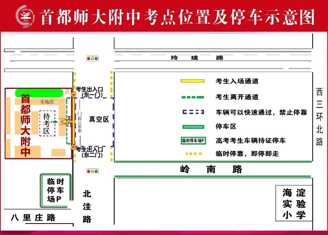 6.首都师大附中考点考生专用通道范围为我校正门南侧、北侧50米以内区域。请家长一人接送考生,即停即走,考生可在专用通道入口处下车,单独进入专用通道。请家长及考生遵守学校标识,配合现场考务人员的引导与指挥,请不要在真空区内停留。(具体见后附示意图)