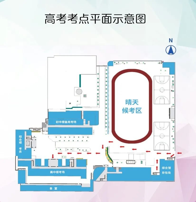 8.我考点将存包处设在综合馆,出于防疫考虑,建议考生除了携带必要的考试用具,不要带其他物品,尽量不去存包。晴天候考区在操场,考生休息室在实验楼一层阶梯教室,考场设在高中楼。雨天考生休息室在实验楼一层阶梯教室和实验楼三层多功能厅。