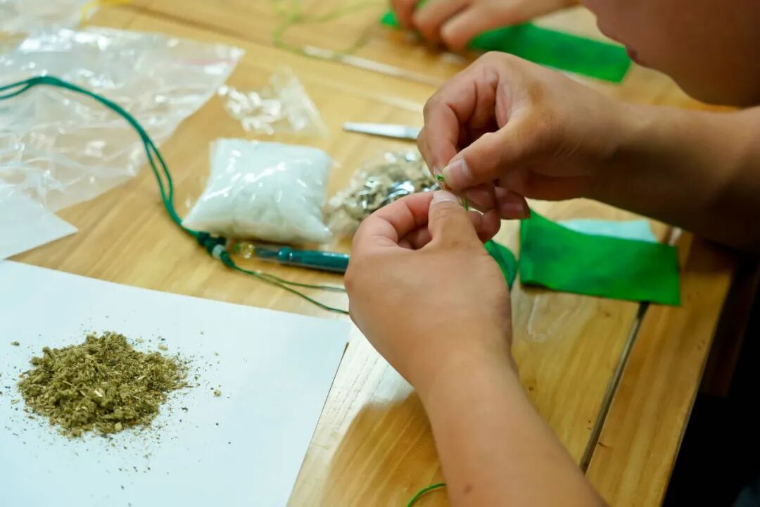活动的高潮部分是香囊的缝制环节。白塔寺药店为本次活动提供了秘制配方的香料,这些香料含有十几味中草药,具有防疫功效。老师们在药师的指导下,一针一线地绣出黄色的莲子,并缝制成莲蓬的样式,寓意着好运“莲莲”。整个过程中,大家互相交流、学习,不仅增进了彼此间的友谊,更在动手实践中感受到了传统文化的魅力。