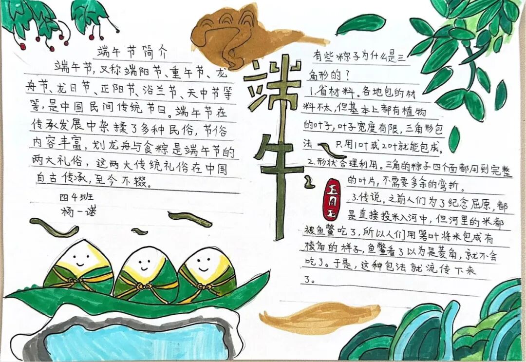 粽子是端午节期间不可缺少的传统美食,中国的粽子不仅馅料丰富多样,形状也是五花八门,但最常见的还是“四角粽子”,也就是三角形的四面体粽子。粽子为什么是三角形?带着这样的问题,四年级的同学们或动手包起了粽子,或上网查起了相关资料,从实用性和民间传说角度给出合理解释,并把发现制作成手抄报。通过这一活动,同学们不仅动手实践,还培养了探究精神和逻辑思维能力。