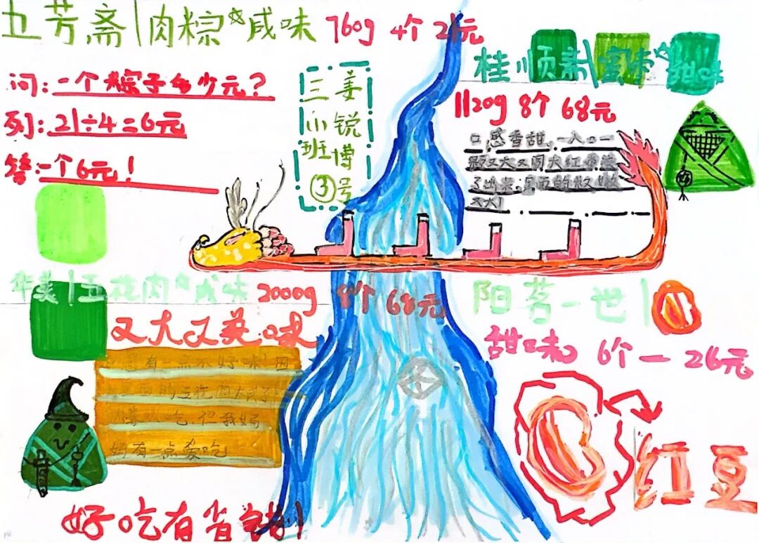 端午节,大大小小、口味各异的粽子已悄然端上了我们的餐桌,相同味道不同品牌的粽子价格截然不同。“端午粽货比三家”,三年级的同学们对不同品牌粽子的价格进行了调查研究,亲自品尝其口感。通过调查研究,选出了所推荐的粽子的品牌和口味,并最终将自己的调查研究和发现制作成了一幅幅漂亮的手抄报。
