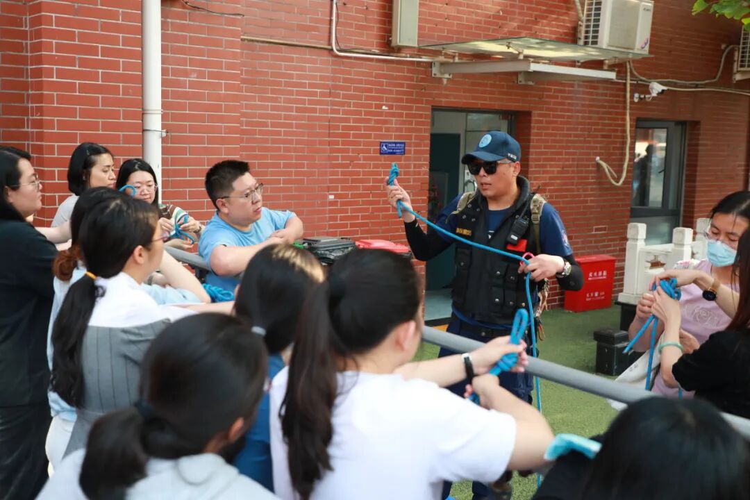 2组教官带领教师们前往了绳索区域,进行了逃生绳结打法学习。在遇到突发火情无法逃脱时,可利用绳结锁扣将自身挂在窗外在等待救援。