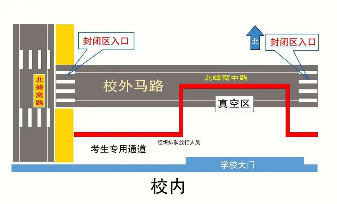 (1)上图中校外马路(北蜂窝中路)在高考期间(6月7-10日)每日7:00-9:00,13:00-15:00实行封闭管理。