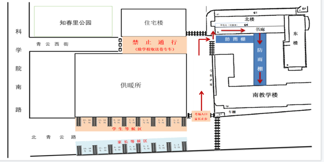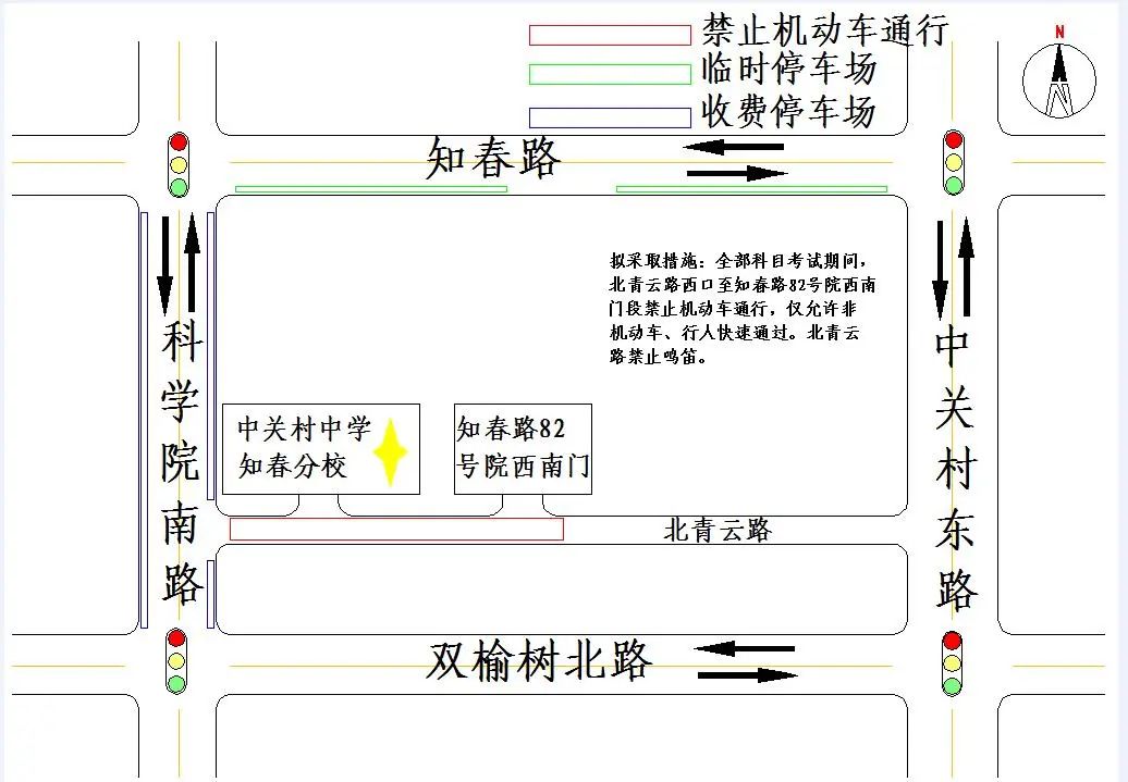 5.北京市中关村中学知春分校考点考生专用通道范围为北青云路西口到学校西南角入口处,由于道路不是主干道,为避免拥堵请家长一人接送考生,车辆不要进入北青云路,在西侧路口南北向即停即走,考生下车后可单独进入北青云路西口,也可以由一名家长陪同行至学校西南角入口处。请家长及考生遵守学校标识,配合现场交管及考务人员的引导与指挥。