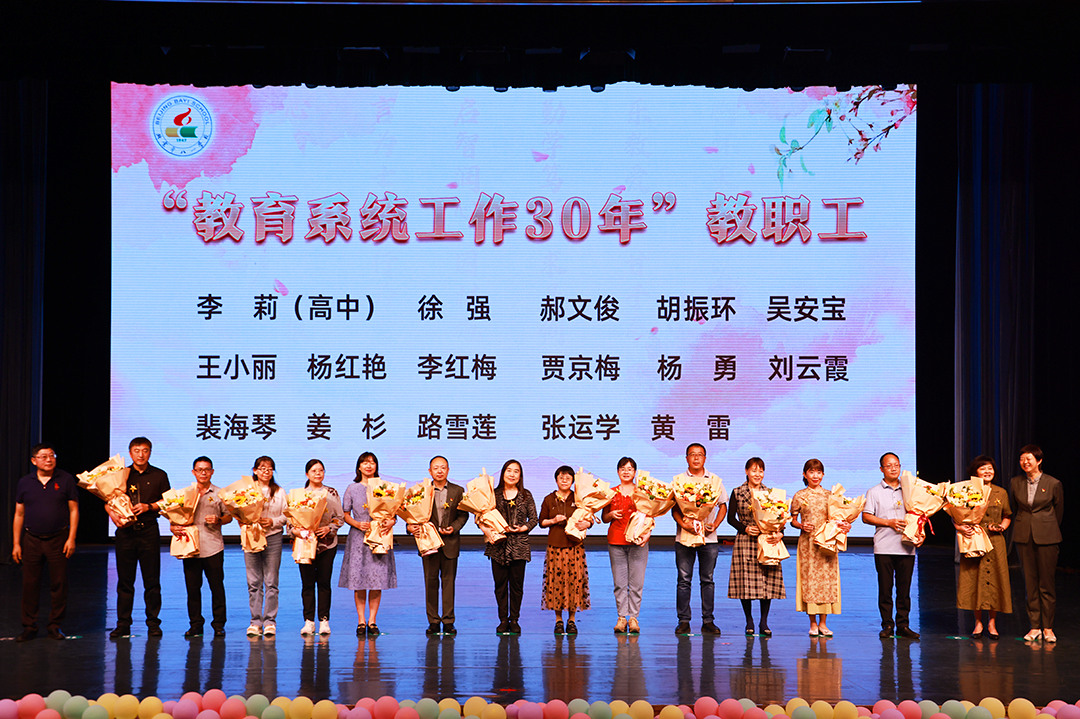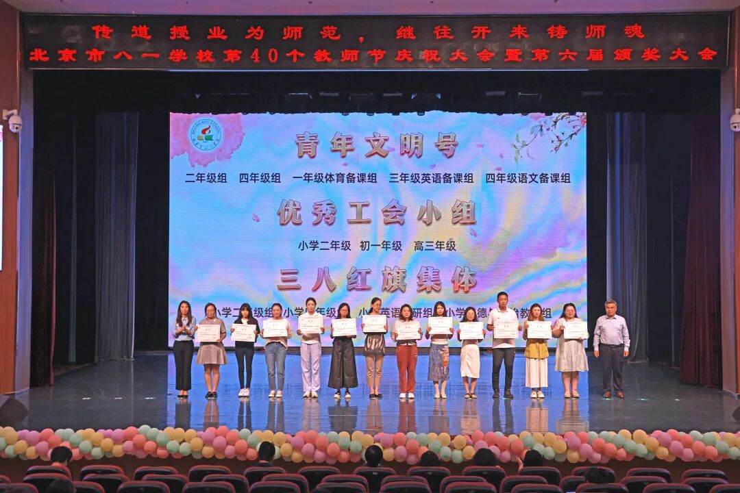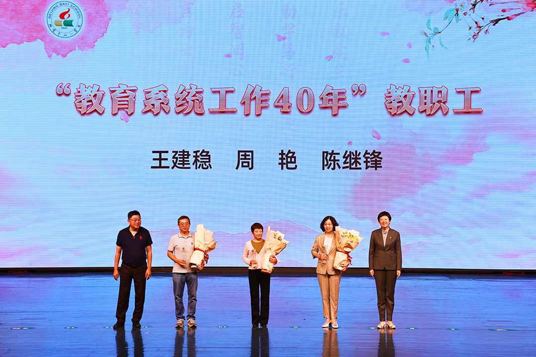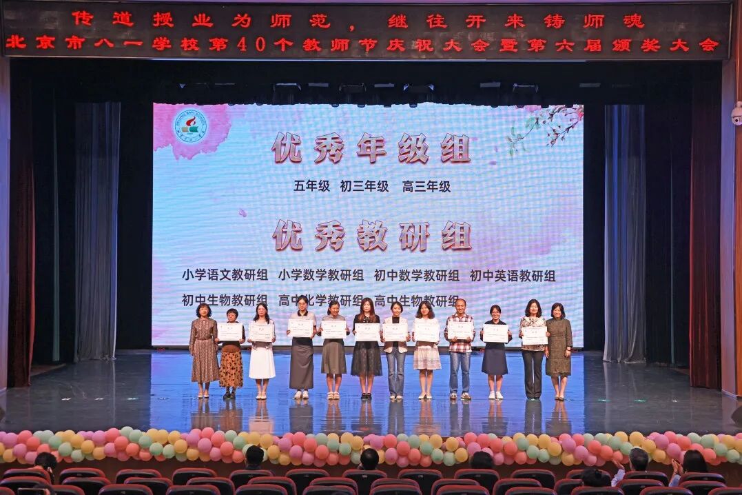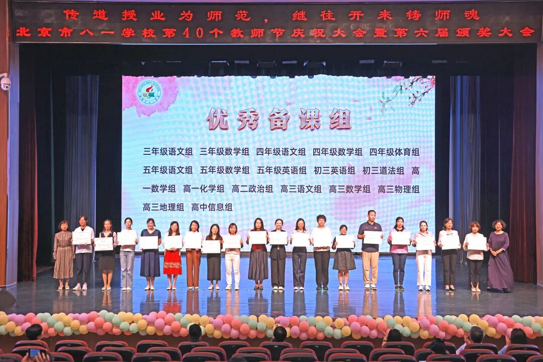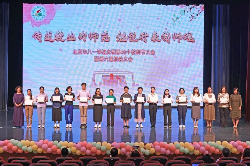 2024年9月9日,北京市八一学校在荣臻礼堂,隆重举行第六届教师表彰大会,庆祝第40个教师节。主题为“传道授业为师范、继往开来铸师魂”。年度十佳教师、教龄30和40年教师、优秀个人及优秀团队代表纷纷走上主席台,鲜花和掌声充盈着整个礼堂。全体八一教师一同见证和感受这一荣光时刻,共庆属于教师的节日,共享属于人民教师的光荣。这场表彰集中了学校给予教师们的崇高荣誉,也将成为八一教师们久久铭记的光辉时刻。