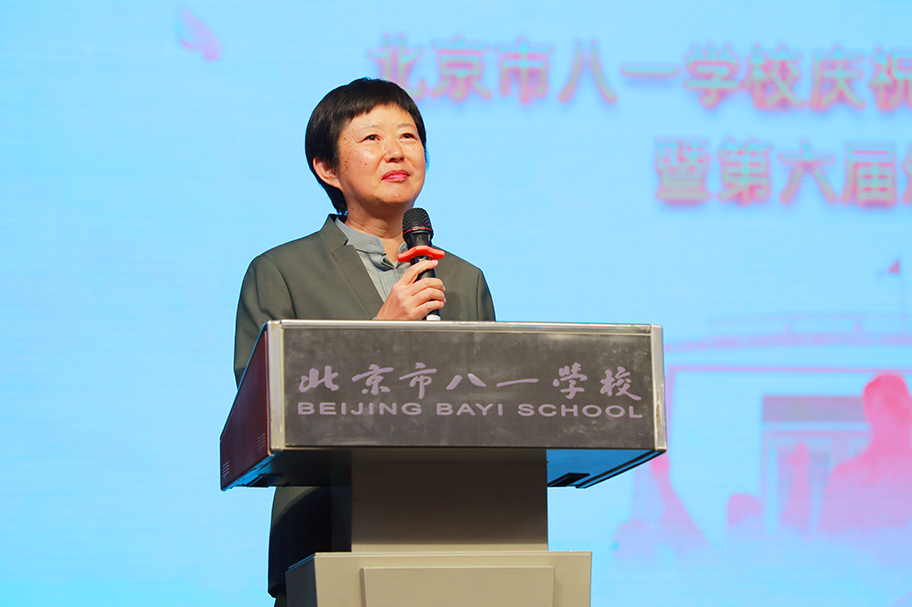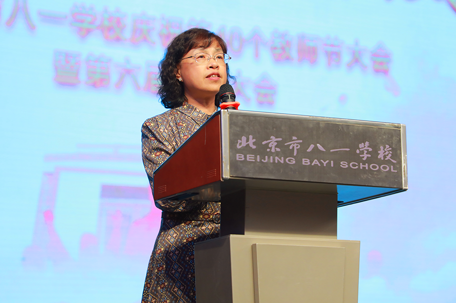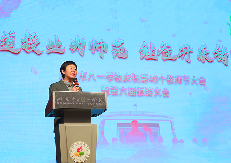 奖项颁发结束,牛震云书记代表八一学校,向辛勤耕耘在学校各个岗位上的教师和教育工作者,表达深深的敬意,并以“八一的创新”为题致辞。她回顾了40年前的一个教师节,学校的缔造者聂荣臻元帅为八一写下“继往开来,开拓无前”。继往开来,是守正创新不忘初心;开拓无前,意味着革故鼎新开辟未来,让思想和思维与时俱进,把新思想、新思维落实到行动上。在2003年,八一学校成为第一所进入示范校行列的普通校,开辟了发展新纪元。在学校做德育工作多年,牛书记也不断要求自己与学生同频,与时代同行,把德育做得有声有色,把学生工作做的有情有义。