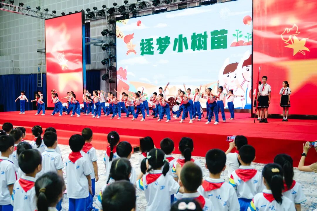 习近平总书记说:“新时代中国儿童应该是有志向、有梦想,爱学习、爱劳动,懂感恩、懂友善,敢创新、敢奋斗,德智体美劳全面发展的好儿童。希望同学们立志为强国建设、民族复兴而读书,不负家长期望,不负党和人民期待。”如今的新队员就像一棵棵小树苗,代表着活力与希望。新队员代表用充满朝气的《逐梦小树苗》表达了他们勇敢去追梦的勇气与撑起一片天空的决心!