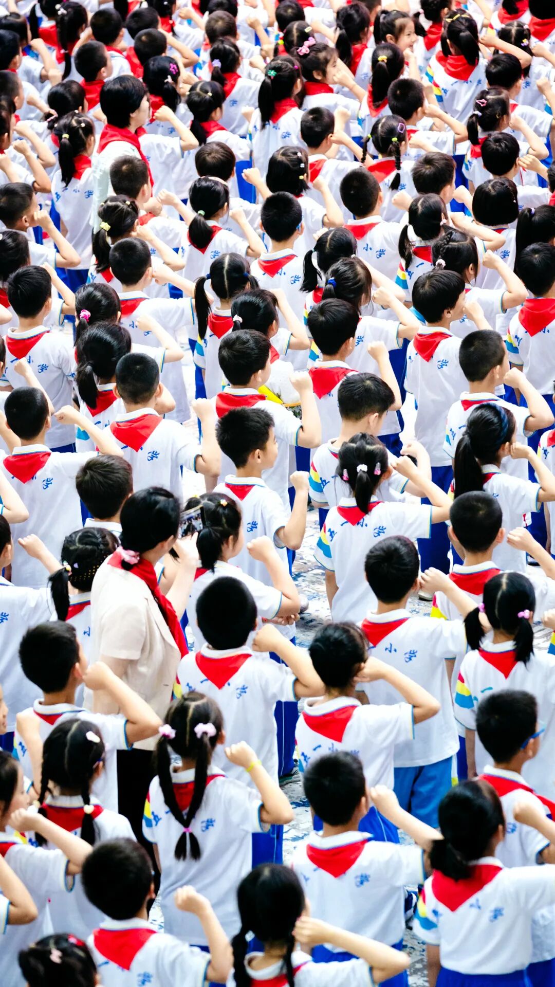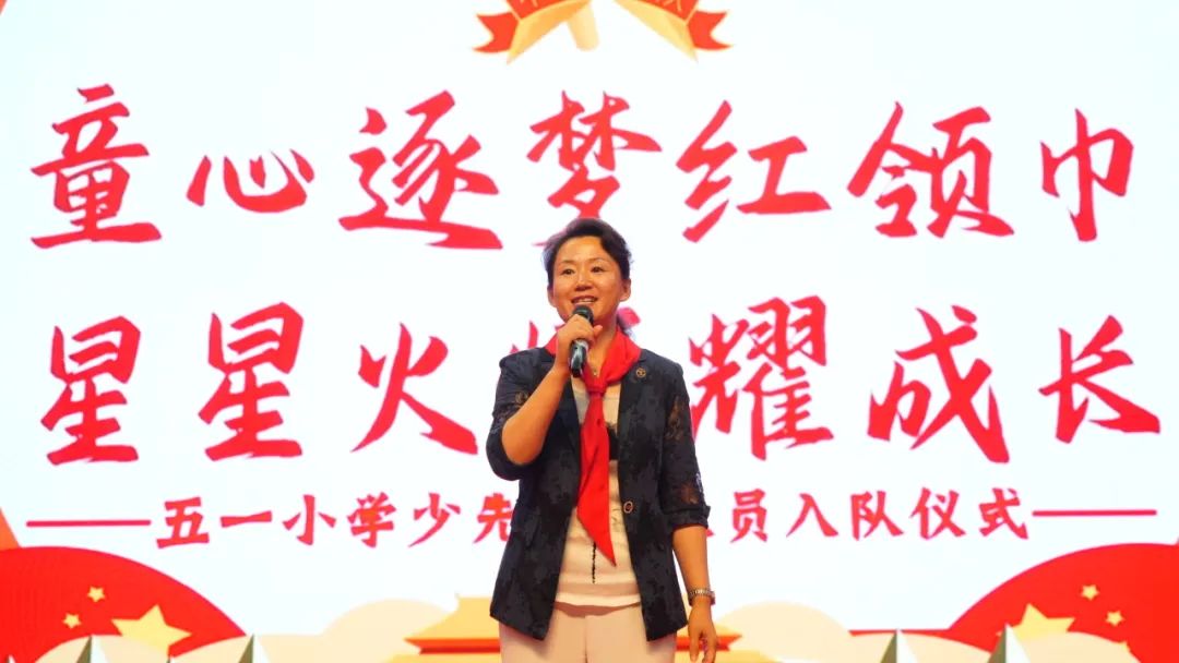 五一小学少先队大队长陈灏轩宣布了入队决定。学校领导、老师和家长代表们为新少先队员授巾。戴上鲜艳的红领巾,就意味着要肩负起一份新的责任!