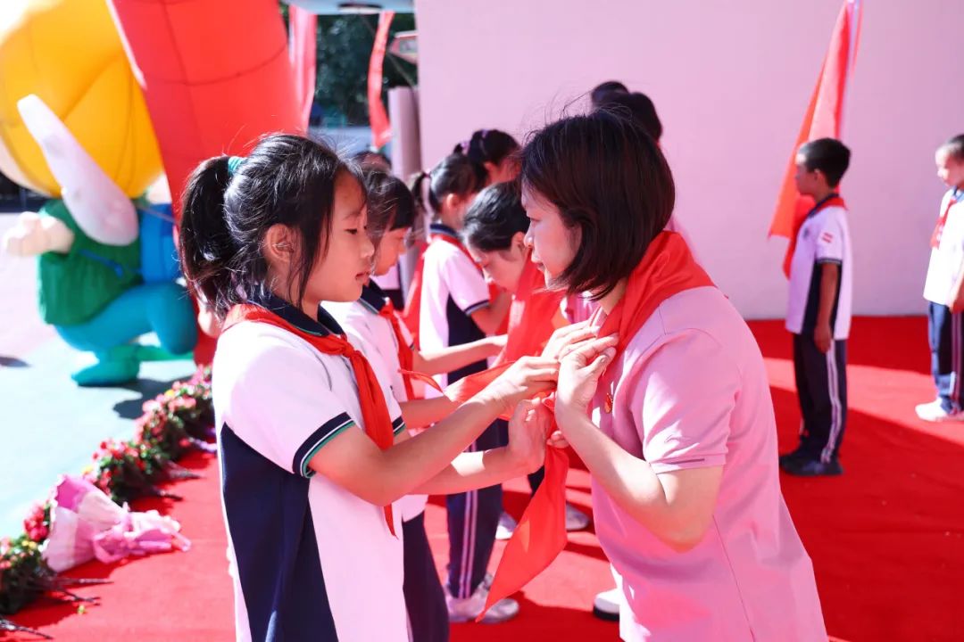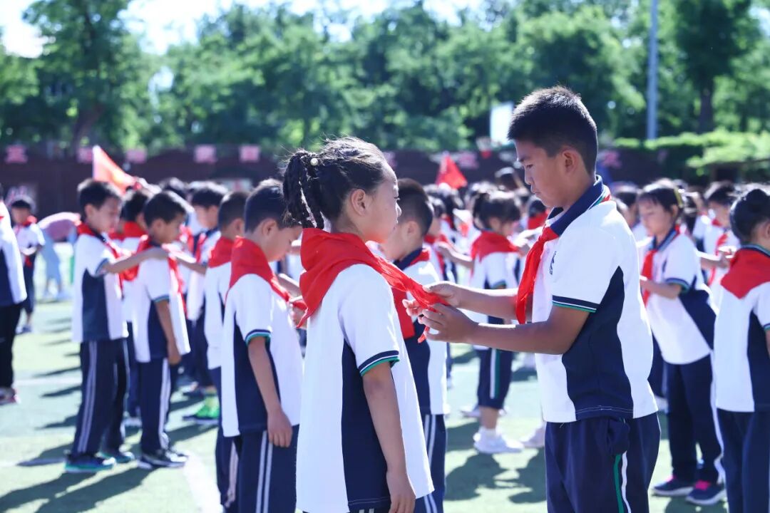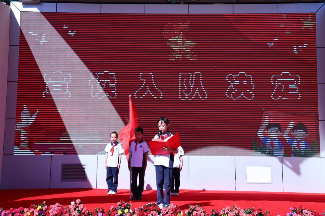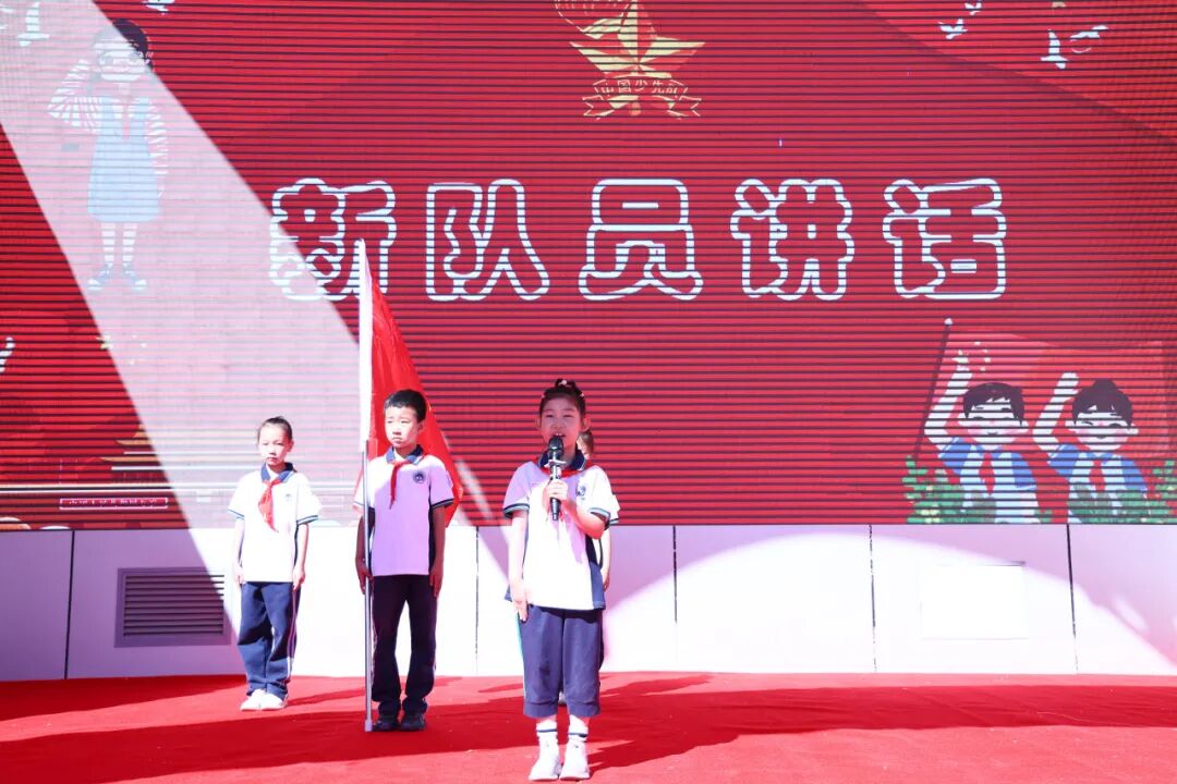 二年级少先队员为新队员佩戴红领巾,少先队代表张玄桐带领全体队员宣誓,“准备着:为共产主义事业贡献力量”,一字一句铿锵有力,充分显示了作为社会主义事业接班人的信心和决心。