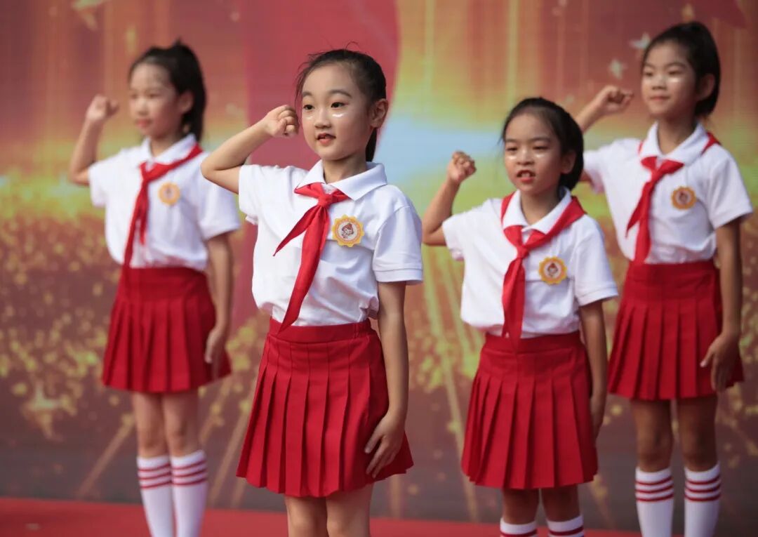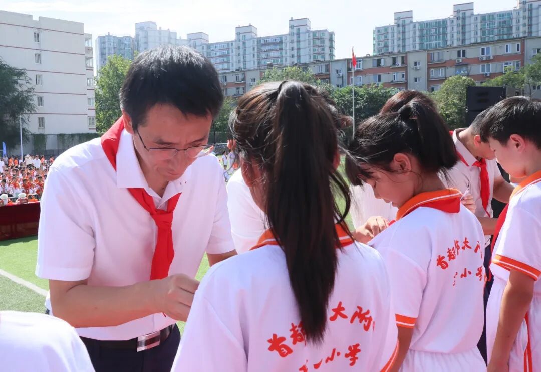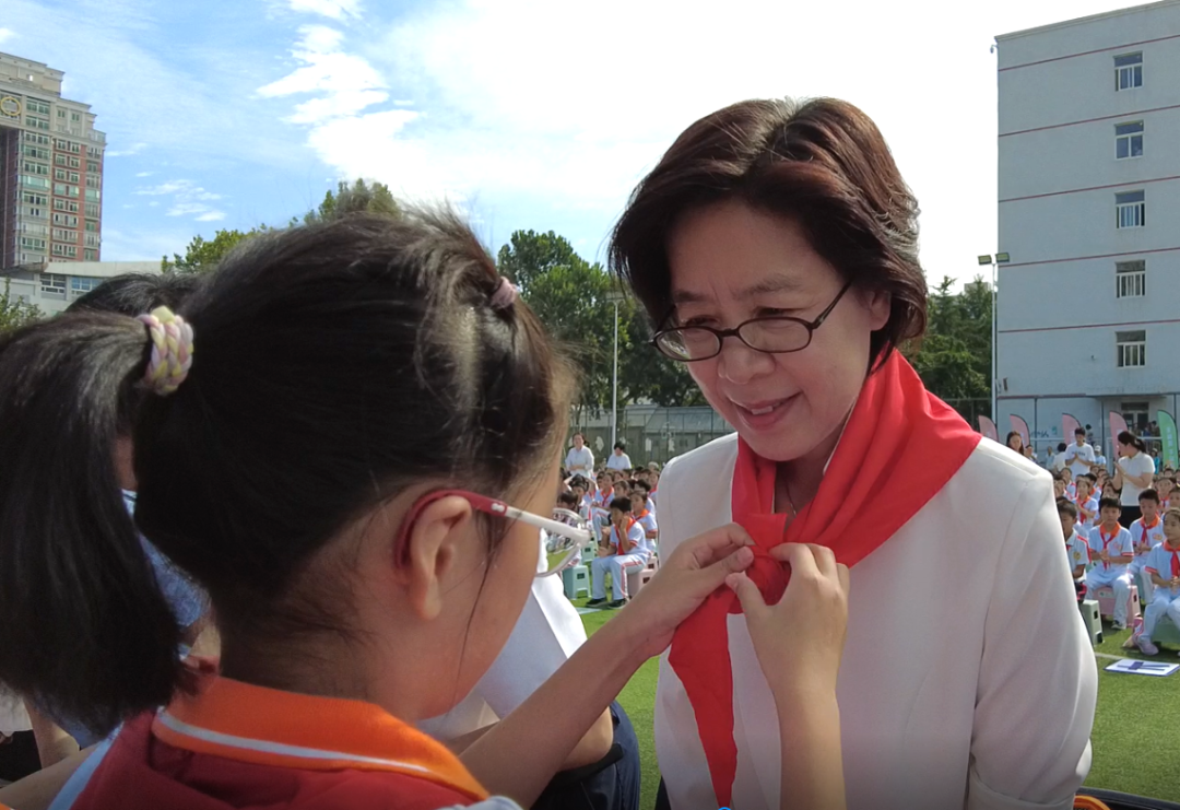 开学典礼前,少先队员代表为与会领导授巾,献上了最崇高的敬意。