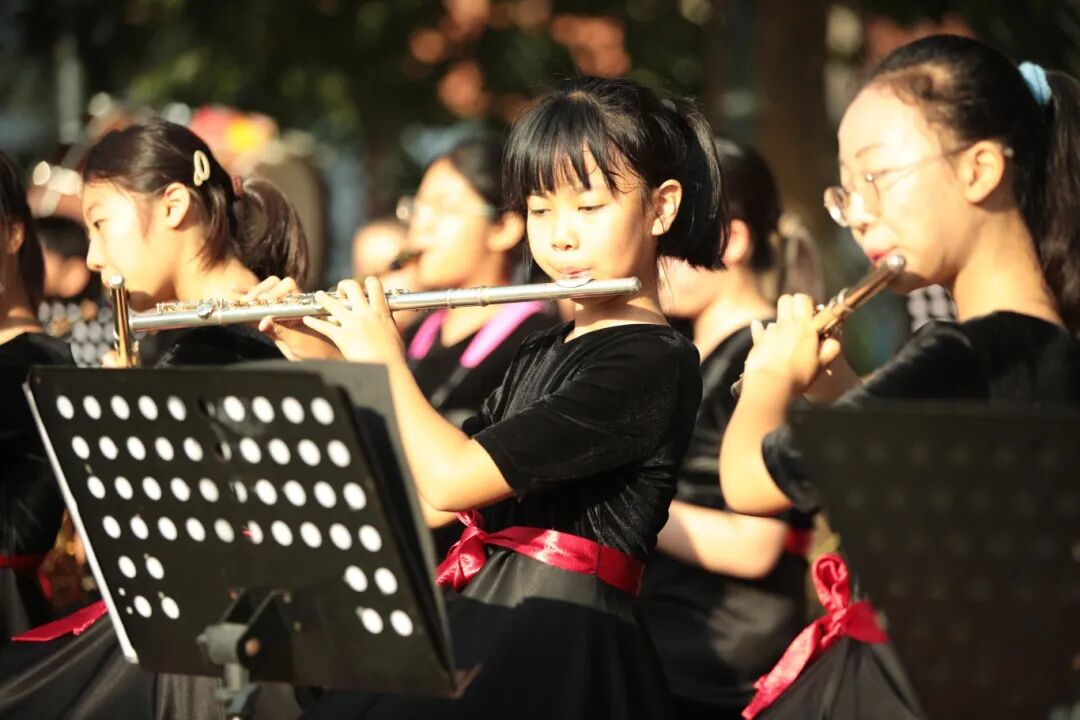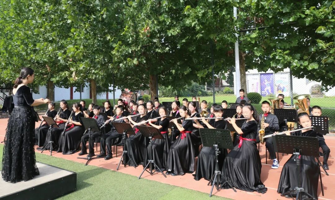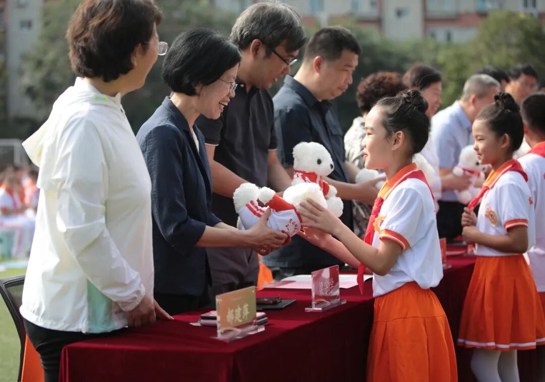 典礼在晨曦的拥抱下缓缓拉开序幕。管乐团与舞蹈团的同学们化作一群追梦的小精灵,用音符编织着晨光的旋律,用舞步勾勒出未来的轮廓。每一个声音、每一个动作,都是对梦想最真挚的呼唤,宣告着在首师附一小这片沃土上,每一个愿景都将被悉心呵护,每一颗心灵都将被点亮。舞蹈团的同学们还为与会领导送上了特别的礼物——校服熊和幸运手环,寓意着新学期的美好开端。