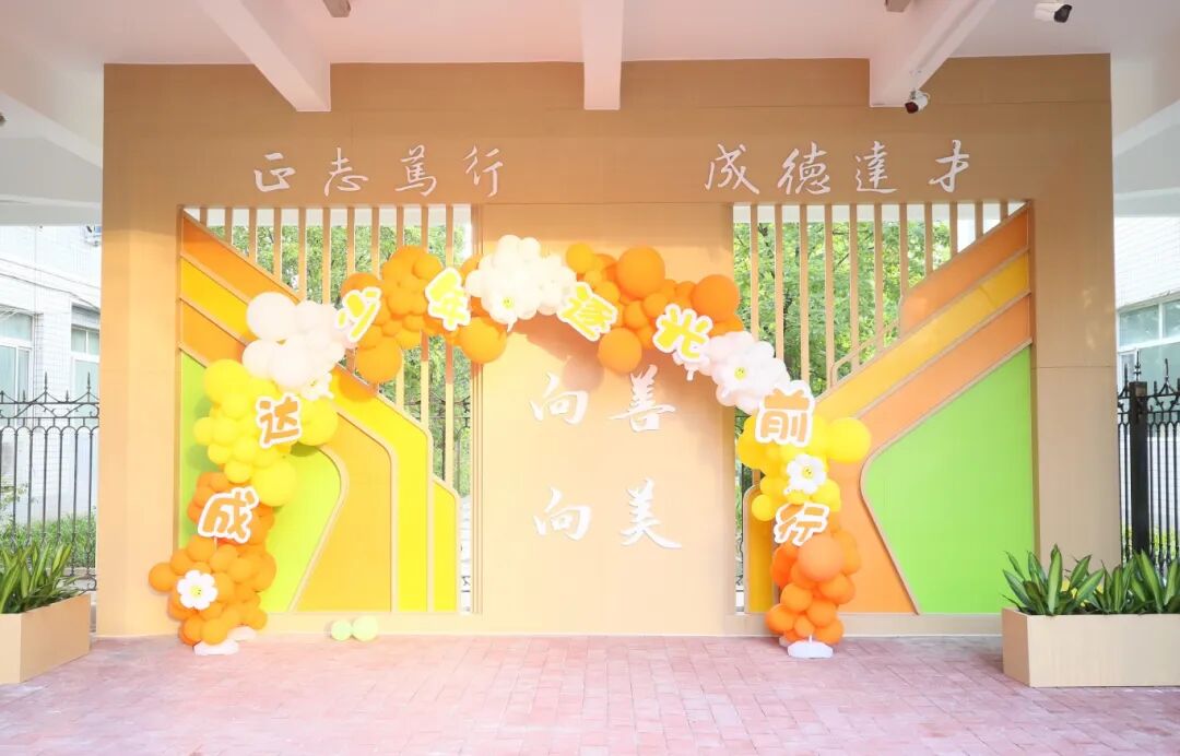 与会领导为各班学生代表佩戴上吉祥物徽章,期待成达少年们永远保持温暖和热忱,像阳光和甜橙一样,追光而行,成德达才;像小一一样,奋力拼搏,永争第一!
