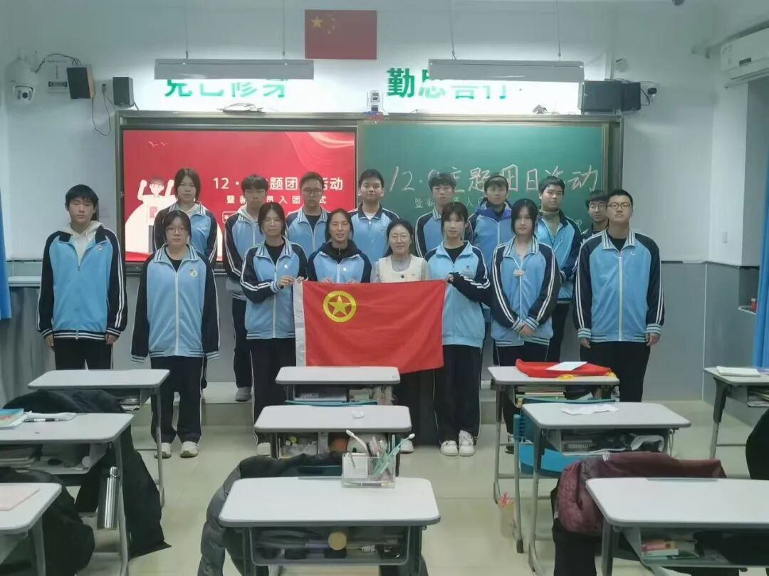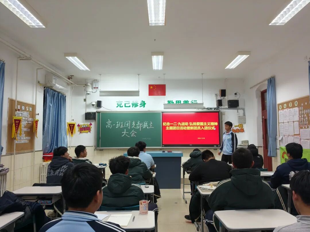高一班以“纪念一二·九运动,弘扬爱国主义精神”主题团日活动为契机,开展了新团员入团仪式和团支部成立大会。回顾“一二·九”精神,在座的学生热情高涨,蕴含爱国精神的火种在心中慢慢燃起,在传承爱国情怀的氛围下,由团总支书记张智宇老师为新团员颁发团员证及团徽,在徐家奥同学的带领下,高一班新团员面向团旗,高举右拳,庄严宣誓,铿锵有力的誓言,振奋人心。新团员代表王成新同学在发言中分享了入团的喜悦和成长的感悟,老团员代表徐家奥同学号召团员要树立崇高理想,发挥模范带头作用。