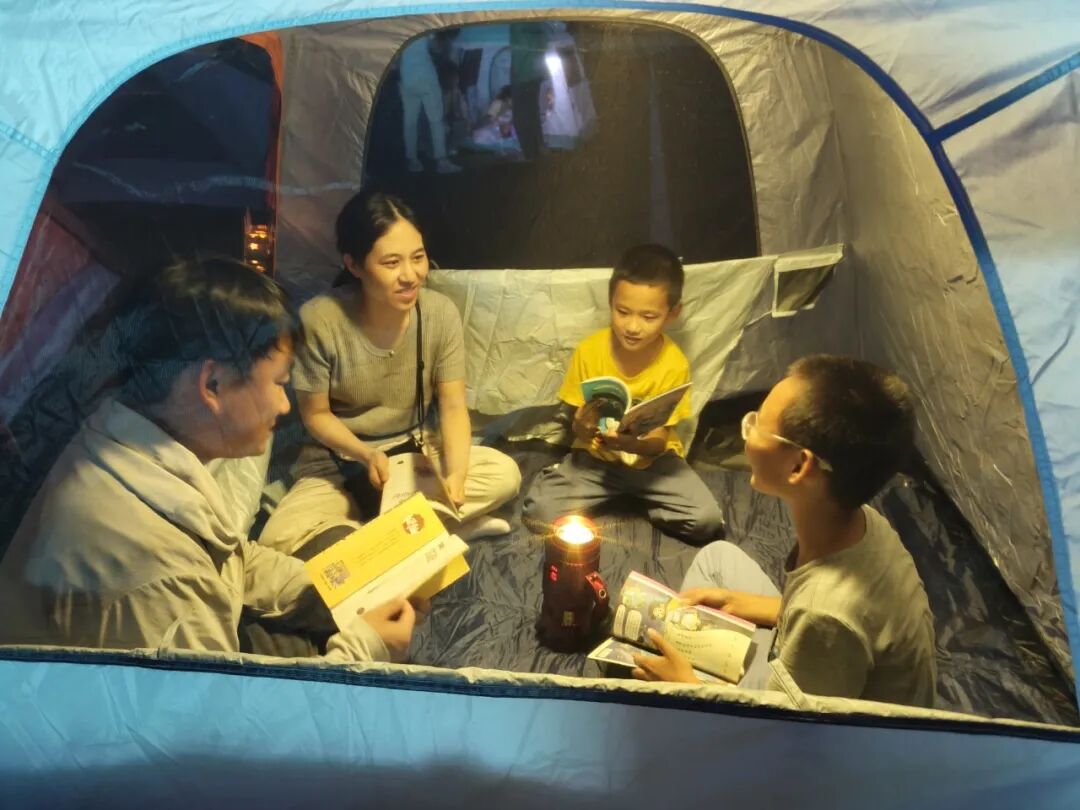 山脚晚风起,书香伴月明。夜幕降临,孩子们在家长的陪伴下走进自家的小帐篷,一盏盏夜读灯亮起来了,和父母一起读一读中秋节的故事和传说,诵一诵有关月亮的诗歌,说一说童年的趣事……星光、月光、灯光,共同点亮了孩子的智慧之光。