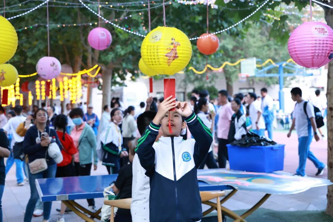 校园被精心“装扮”,充满了浓厚的节日气氛。万千灯火摇曳处,一川月白照古今。五彩纸轻掩的朦胧光晕,如弥漫在空气中的氤氲香气。字签在风中摩挲出“沙沙”的声响,其上写出玲珑的字句,这是中秋猜灯谜的活动。一串串精巧的小灯夹杂于灯笼之间,与一轮明月一同悬挂在空中,抬眼静望,便是触手可及的星辰点点,你我则是徜徉于仙境之客,在此情此景中流连忘返。身边的谈话声、欢笑声,又将人们带回到人间烟火中来。同学们兴致勃勃地探讨着谜底,思考碰撞出耀眼的火花,还有的聚在一起,在月色之下共享欢乐的时光,共同迎接这场中秋盛宴。