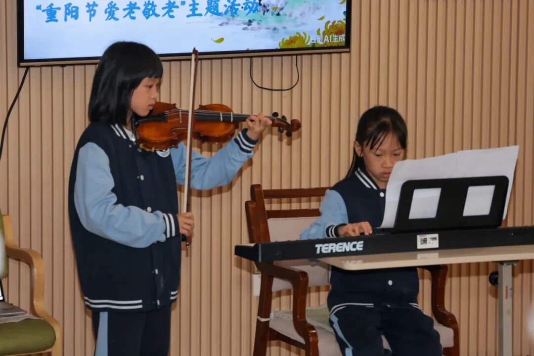 钢琴与小提琴合奏《永远同在》,旋律悠扬婉转,瞬间俘获在场听众的心;葫芦丝演奏《半壶纱》,音色清亮柔和,尽显古典韵味;童声合唱《让我们荡起双桨》,熟悉的曲调唤起了老人们的青春记忆;互动节目《脑筋急转弯》,让老人们积极参与其中,笑声不断;琵琶演奏《洋娃娃和小熊跳舞》《玛丽有只小羊羔》,节奏活泼明快,充满童趣;单口相声《卖花生》,幽默的语言逗得老人们开怀大笑;圆号演奏《我爱这蓝色的海洋》,气势恢宏,令人心潮澎湃;舞蹈与古筝演奏《高山流水》,舞美与乐美相融,尽显古典雅致;小合唱《小美满》,歌声甜美动听,传递出满满的幸福感;最后,诗朗诵《献给爷爷奶奶的歌》,字字情真意切,更是将汇演氛围推向高潮,让老人们感受到浓浓的关怀与爱意。