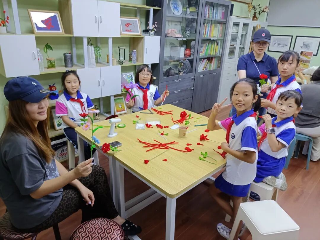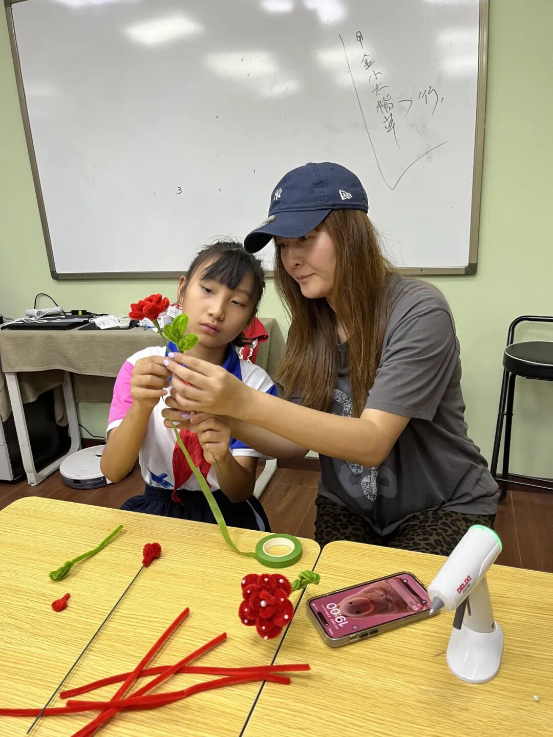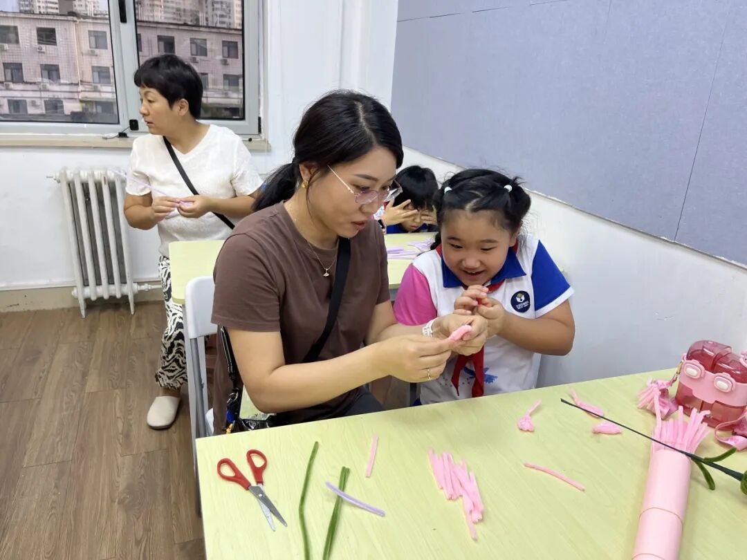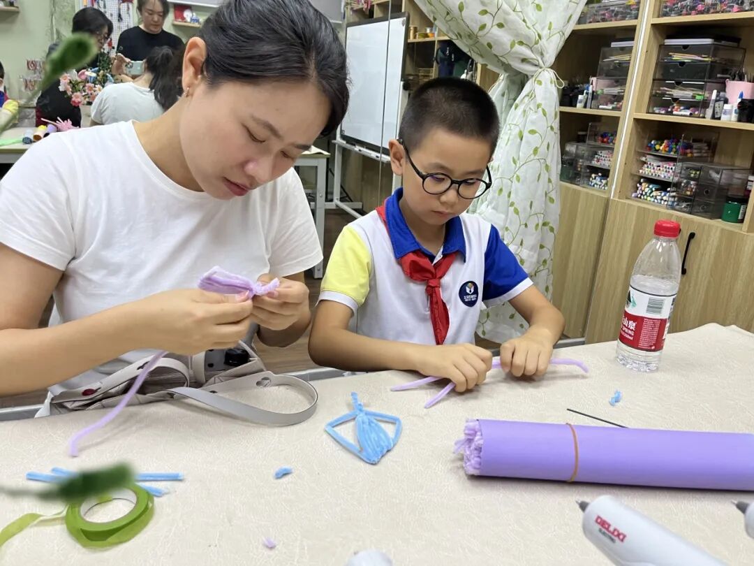 精致的玫瑰吸引了很多同学。助教家长手把手地教孩子们如何将花瓣一片片地卷出弧度,再层层包裹成含苞待放的模样。虽然手法稚嫩,但那份想要做出最美丽花朵的心意无比真挚。