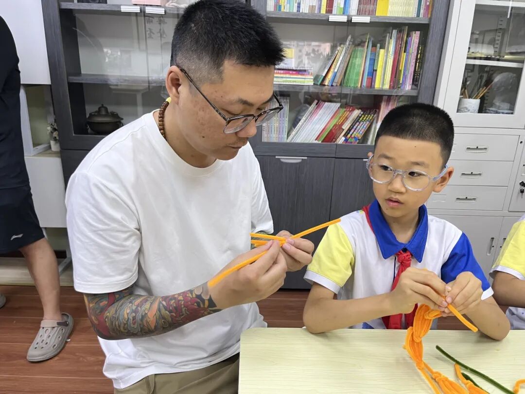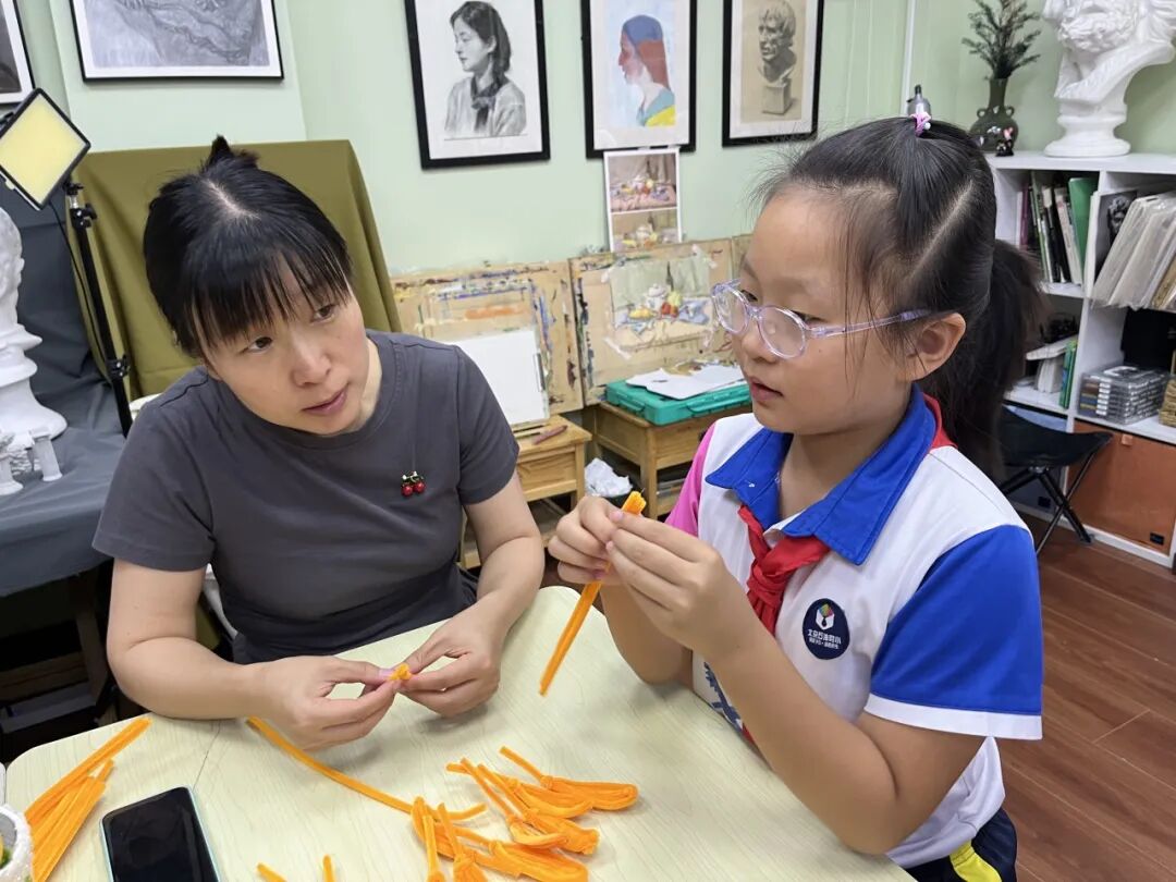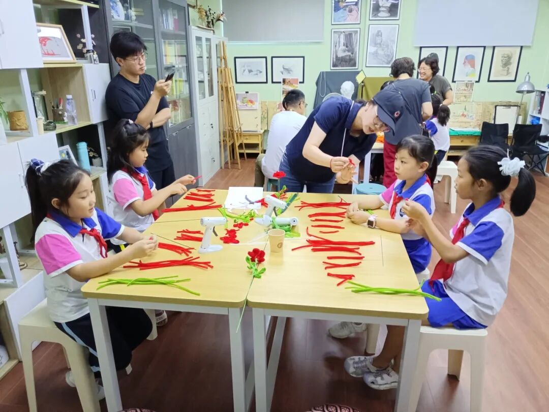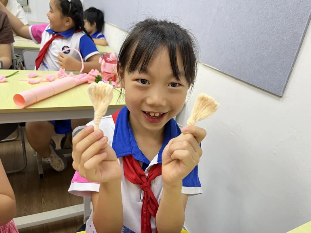 精致的玫瑰吸引了很多同学。助教家长手把手地教孩子们如何将花瓣一片片地卷出弧度,再层层包裹成含苞待放的模样。虽然手法稚嫩,但那份想要做出最美丽花朵的心意无比真挚。