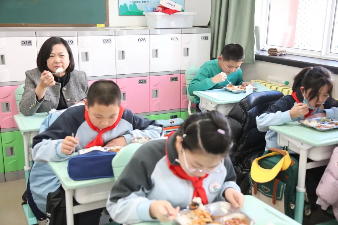 校长在班级陪同孩子们一起就餐。