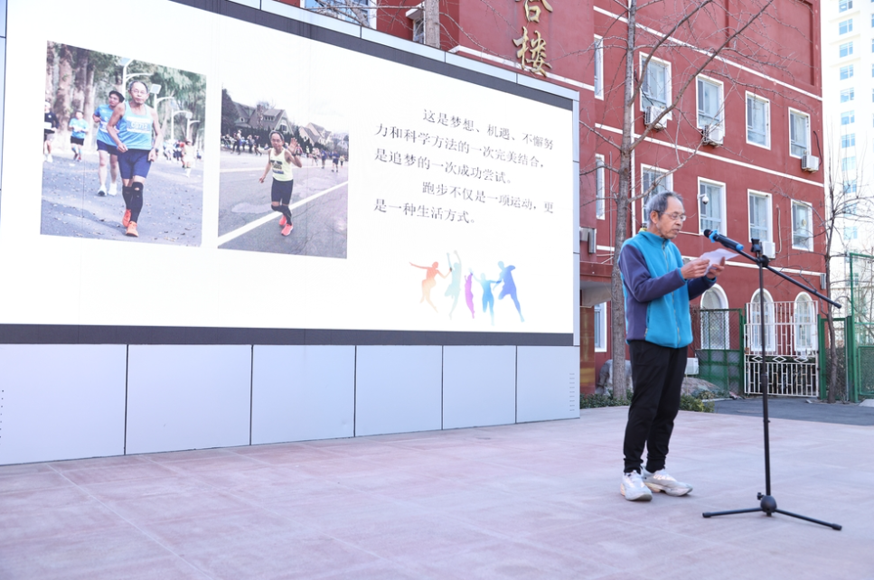北航电子信息工程学院的退休教授潘仲英老师应邀来到开学典礼现场,82岁高龄的潘老师与大家分享了对马拉松项目的热爱与心得,他告诉同学们跑步不仅是一项运动,更是一种生活方式。长期坚持跑步,不仅能够铸就健康的体魄,更能磨练意志,帮助自己去勇敢迎接未来的种种挑战。他勉励同学们坚持体育运动,用脚步丈量土地,以汗水书写篇章,向着终点冲刺,发现更强大、更美好的自己。