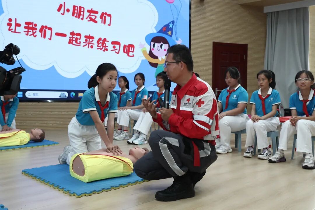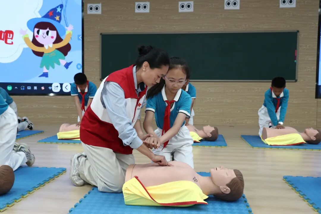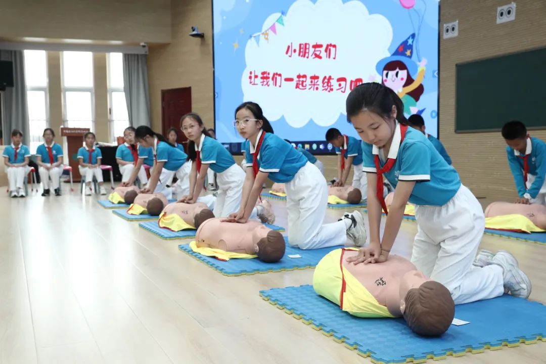在学校多功能厅,军红救援队培训中心贾主任为五年级师生们带来了一场精彩的心肺复苏急救知识培训。贾主任通过生动的案例和现场演示,详细讲解了心肺复苏的意义及操作步骤与要领,并邀请学生上台进行实操练习。经过两个小时的训练指导,五年级的每一位同学都能正确地掌握这一技能。学生们积极参与,认真学习每一个动作,现场学习氛围浓厚。