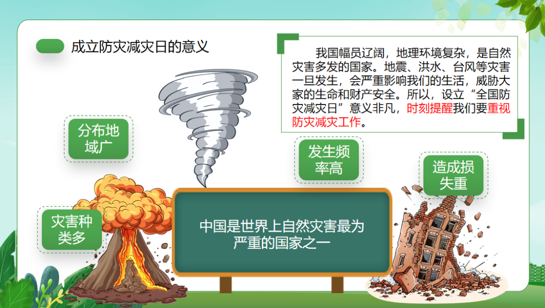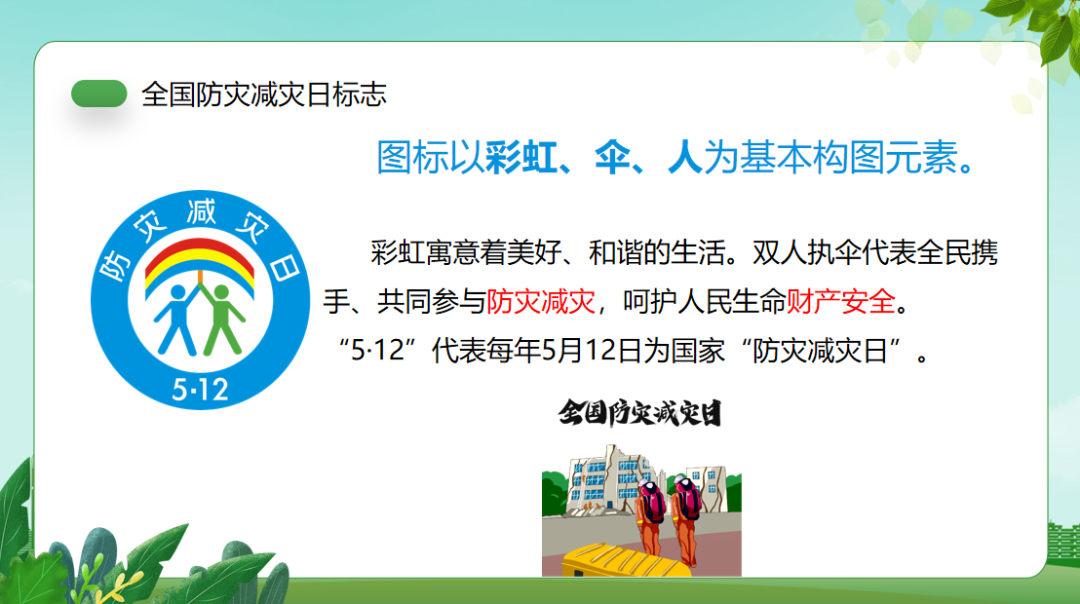 回首到汶川大地震的那一天,2008年5月12日,四川汶川发生了里氏8.0级特大地震。瞬间,山崩地裂,无数鲜活的生命永远定格在了那一刻……为了缅怀在地震中逝去的同胞,也为了时刻警醒世人,国家将这一天定为“全国防灾减灾日”。几位小主持人介绍了“全国防灾减灾日”的意义和标志。