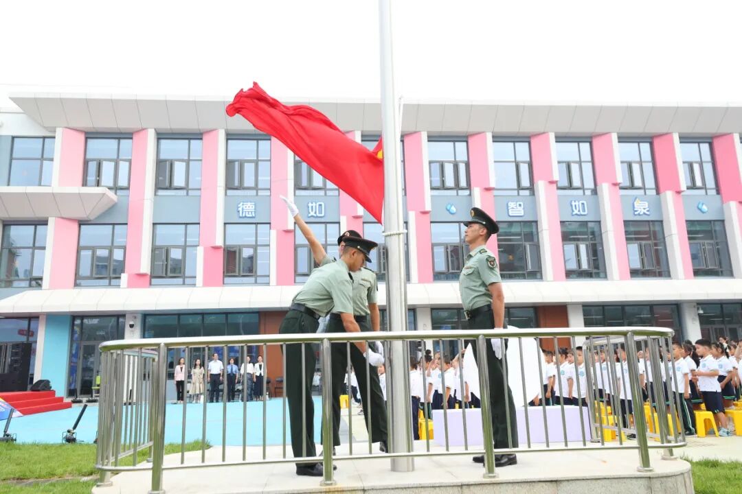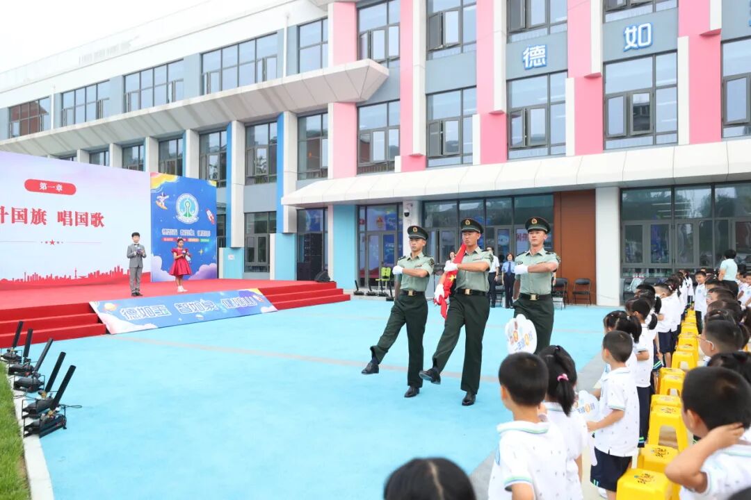 “出旗!”随着主持人铿锵的指令,解放军叔叔迈着整齐划一的正步护送国旗入场。全校师生瞬间肃立,少先队员行队礼,目光追随着航天校区的第一面五星红旗冉冉升起。雄壮的国歌声回荡在校园上空,这堂生动的“爱国启蒙课”,庄重又深刻。仪式结束后,师生们用热烈掌声向解放军叔叔致谢。