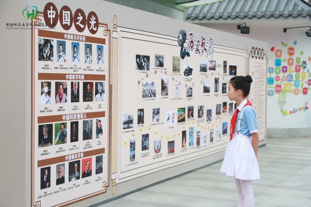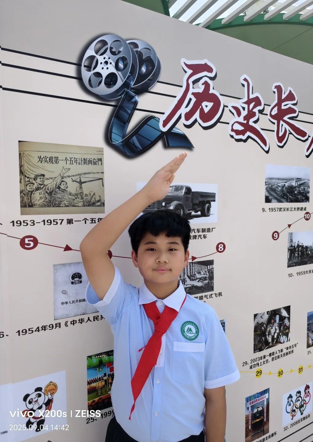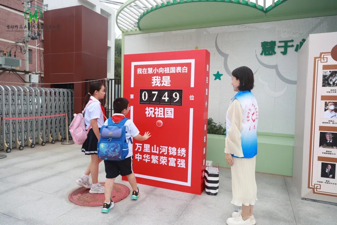 慧小娃们入校之际,校园化身为沉浸式爱国主义教育乐园。门口“为祖国送祝福”前,同学们按下打卡按钮;历史长廊中,一张张鲜活的照片与文字无声诉说着峥嵘岁月,引人流连驻足。