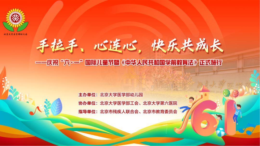 本次活动由北京大学医学部幼儿园主办,北京大学医学部工会、北京大学第六医院协办,北京市残联、北京市教委指导。教育部、北京市、海淀区委政府领导、专家学者、爱心企业及媒体代表等出席,为孩子们送上节日祝福,并借此契机宣传普及《学前教育法》,提升社会各界对学前教育重要性与规范性的认识,共同营造的良好儿童成长环境。