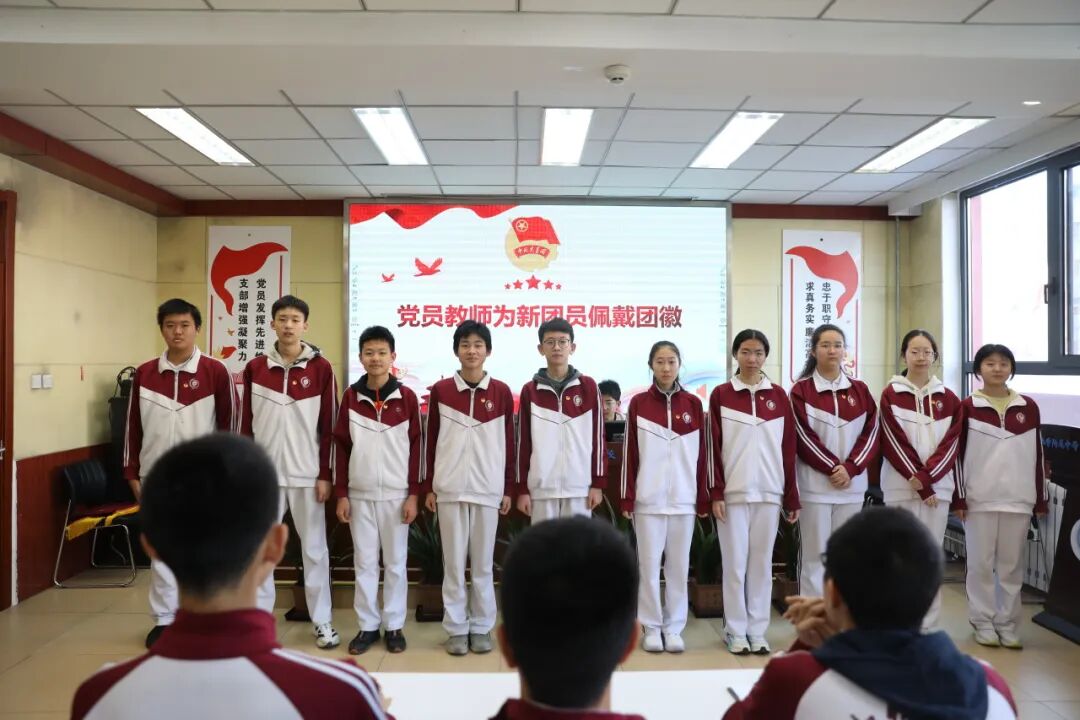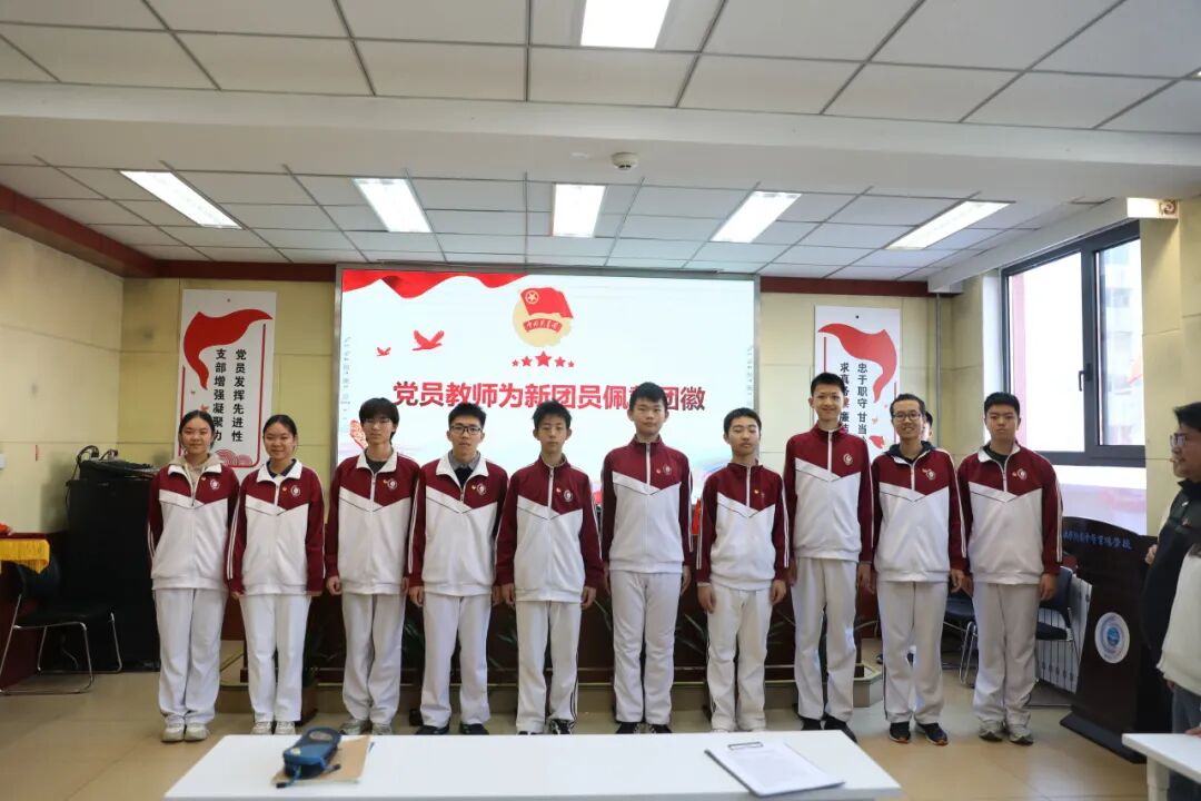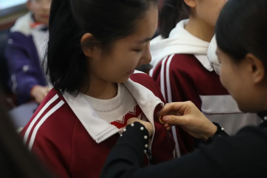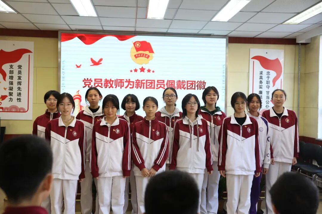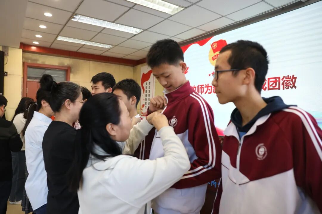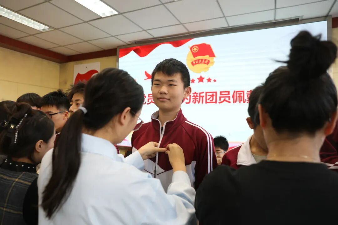 党员教师为新团员佩戴团徽。一枚徽章,一份重量;一次托付,一生信仰。