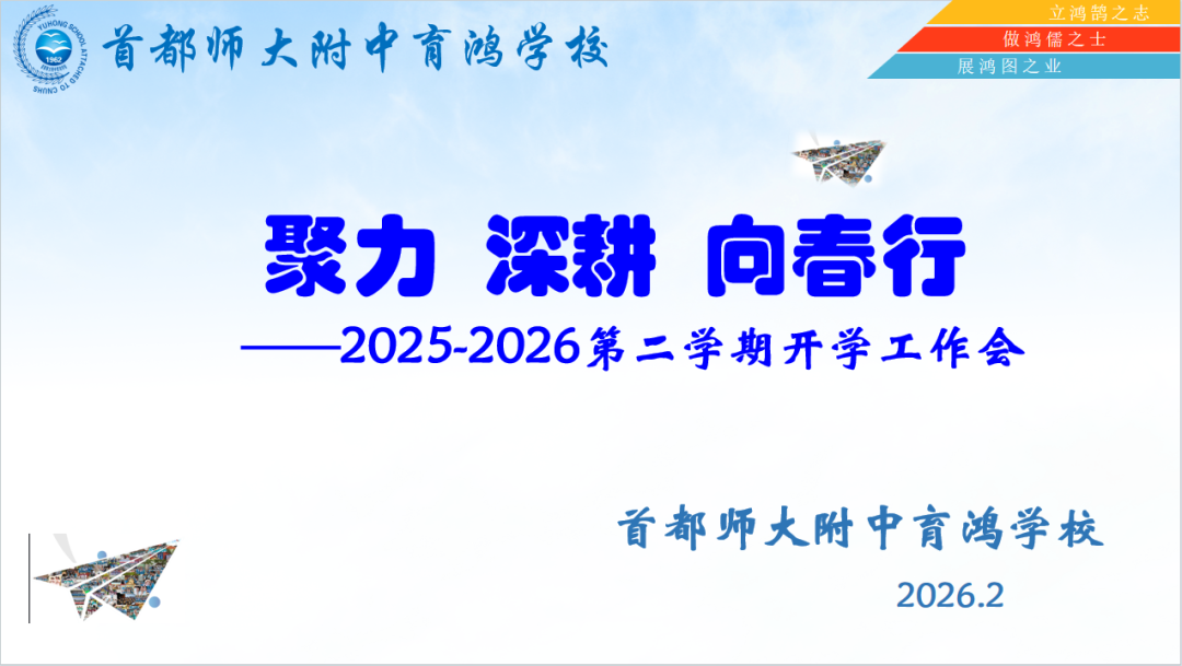 “寒雪梅中尽,春风柳上归。”2月26日至27日,首都师大附中育鸿学校2026年春季学期开学大会在融融春意中拉开帷幕。全体教职工以“聚力·深耕·向春行”为号,共赴这场新学期的春日之约。
