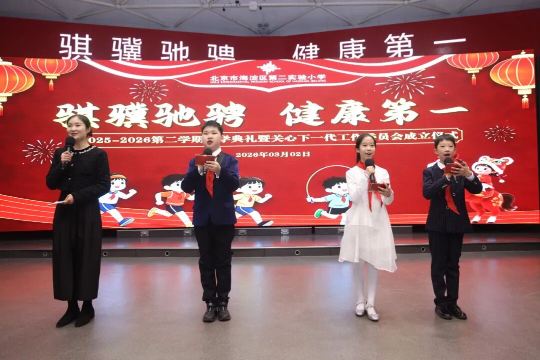 春风拂暖启新程,骐骥扬蹄向未来!3月2日,北京市海淀区第二实验小学以“骐骥驰骋 健康第一”为主题,隆重举行2025-2026学年第二学期开学典礼暨关心下一代工作委员会成立仪式。健康理念点亮开学第一课,传统元宵灯谜邂逅前沿科创,红色薪火碰撞AI智慧,全体师生在满满仪式感中,赴一场向光而行、向健而行的新学期之约!
