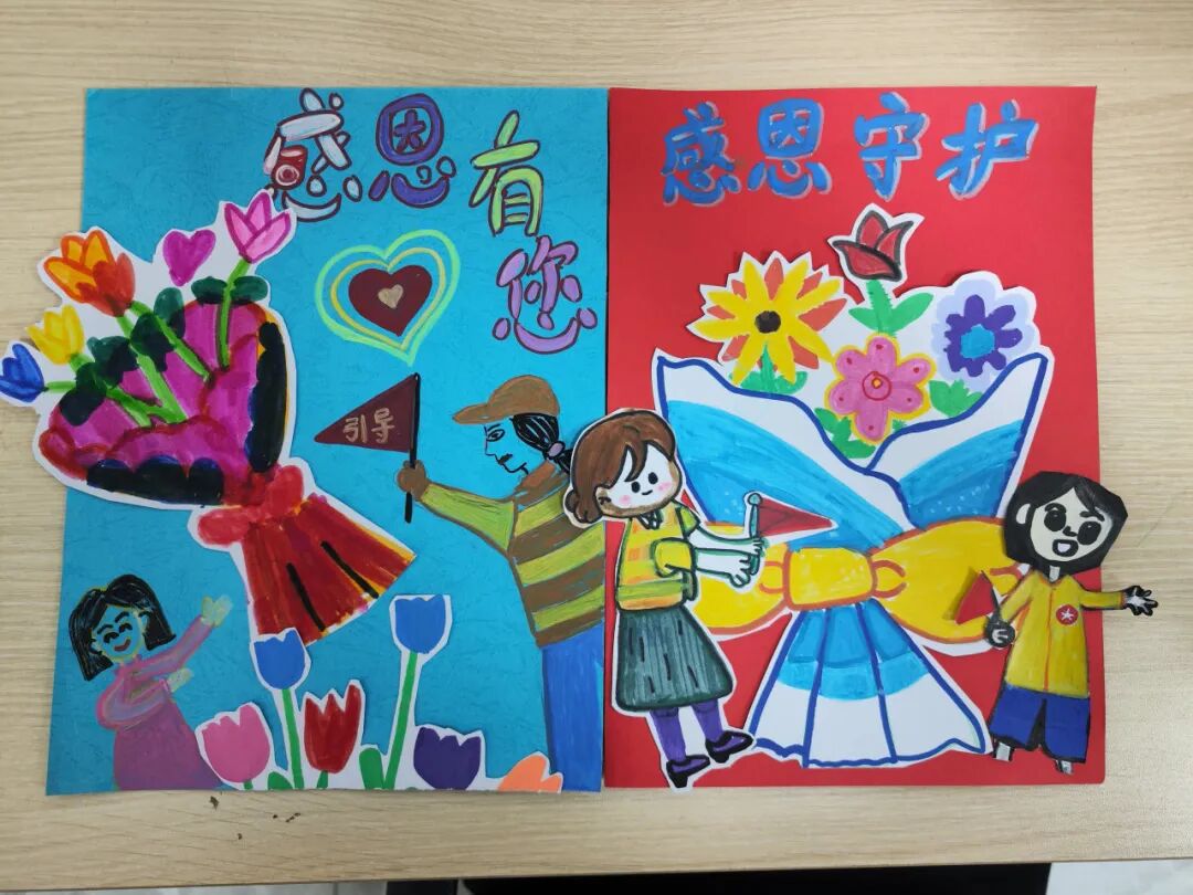 二年级队员们在美术老师指导下,亲手制作精美感谢卡,送给每日坚守岗位、守护安全的警察、引导员、协管员、保安等工作人员。