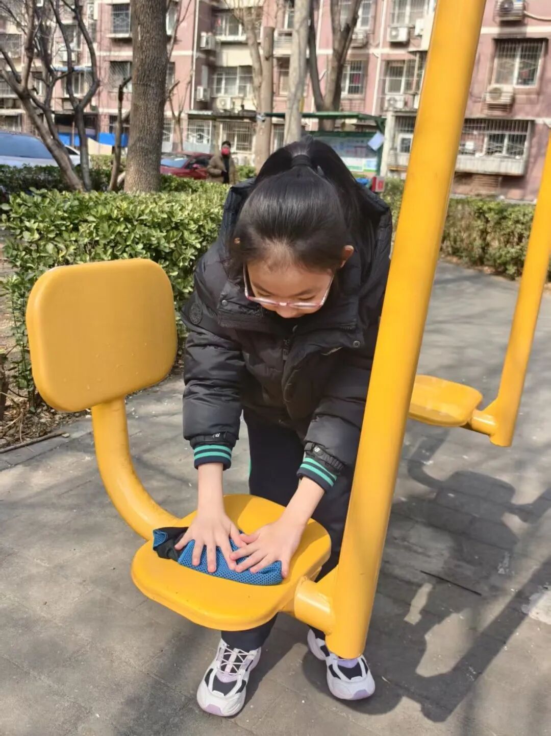 联合中队的队员们走进定慧西里社区,细心擦拭社区健身器材,用汗水扮靓环境,让雷锋精神在行动中闪光。