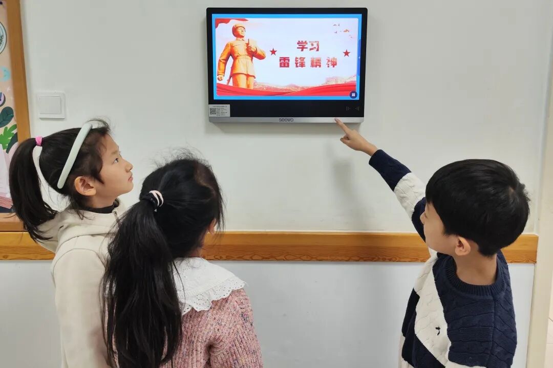 东校区借助校园广播、电子大屏等载体,循环播放雷锋事迹与雷锋精神解读,让低年级队员在耳濡目染中认识雷锋、了解雷锋,让榜样力量浸润童心。